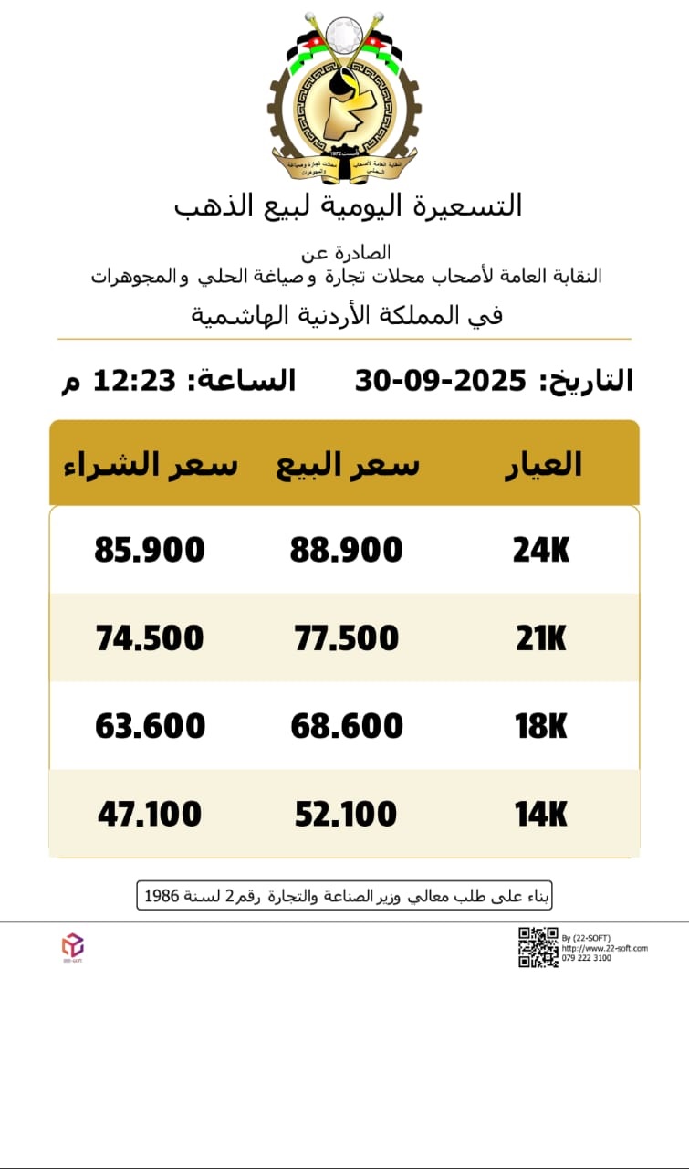 وبحسب التسعيرة الثالثة الصادرة عن النقابة العامة لأصحاب محالّ تجارة وصياغة الحلي والمجوهرات، تراجعت أسعار الذهب، ليصل سعر بيع غرام الذهب عيار 21 –الأكثر طلبًا من قبل المواطنين– إلى 77.50 دينارًا لغايات البيع من محالّ الصاغة، مقابل 74.40 دينارًا لغايات الشراء.