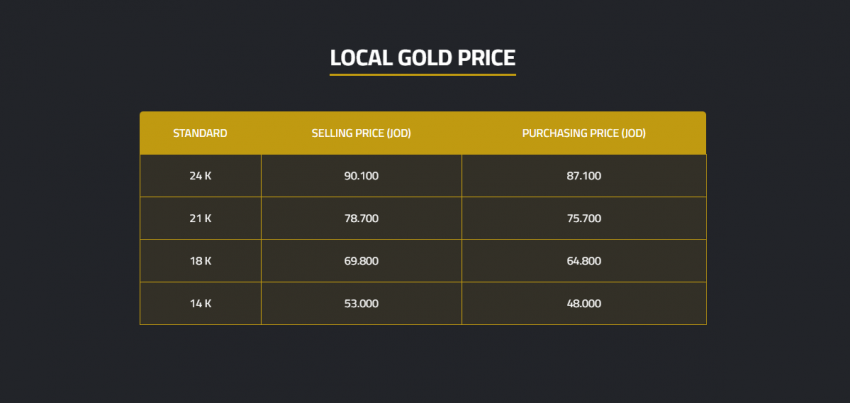 وبحسب التسعيرة الصادرة عن النقابة العامة لأصحاب محالّ تجارة وصياغة الحلي والمجوهرات، وصل سعر بيع غرام الذهب عيار 21 – الأكثر طلبًا من قبل المواطنين– إلى 78.70 دينارًا لغايات البيع من محالّ الصاغة، مقابل 75.70 دينارًا لغايات الشراء.
