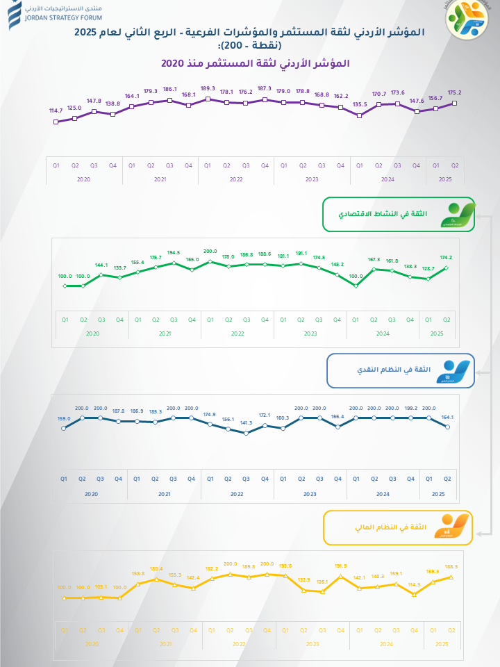 للعلّم - شهد المؤشر الأردني لثقة المستثمر، الصادر عن منتدى الاستراتيجيات الأردني، للربع الثاني من العام الحالي، ارتفاعا بنسبة 11.7%، ليصل إلى 175.2 نقطة، بعد أن كانت قيمته 156.9 نقطة في الربع الأول من عام 2025.
