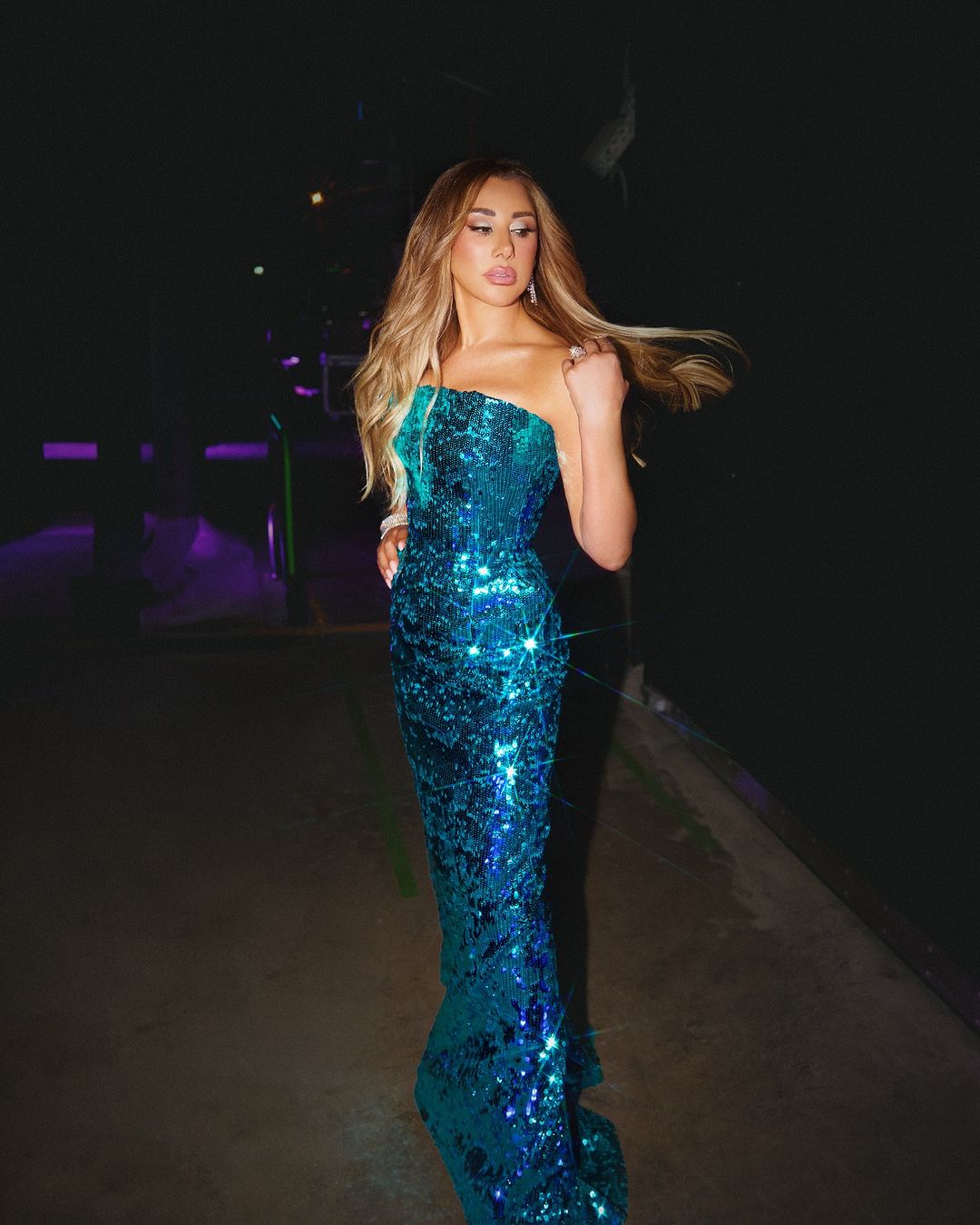 على مسرح أوبرا دبي، تألقت نجوى بفستان لؤلؤي لامع بصيحة الكورسيه المخصر مع قصة ذيل الحورية. التصميم اعتمد الثنيات التي غمرت القوام بأناقة، مع قصة سترابلس أنثوية.