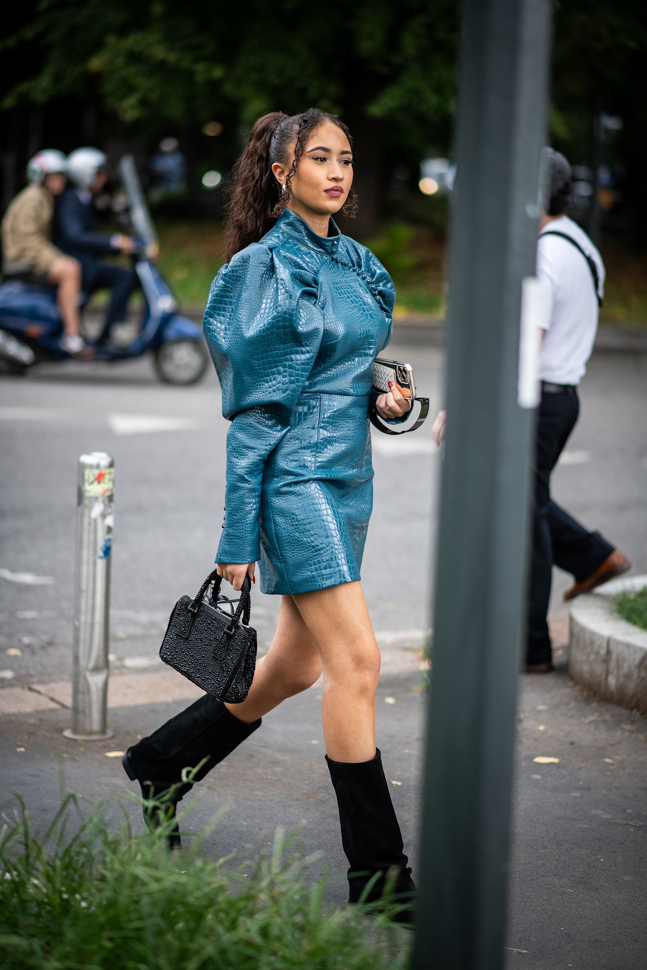 للسهرات: اعتمدي فساتين بأقمشة فاخرة وأكمام كبيرة مع حقيبة كلاتش وكعب أنيق.