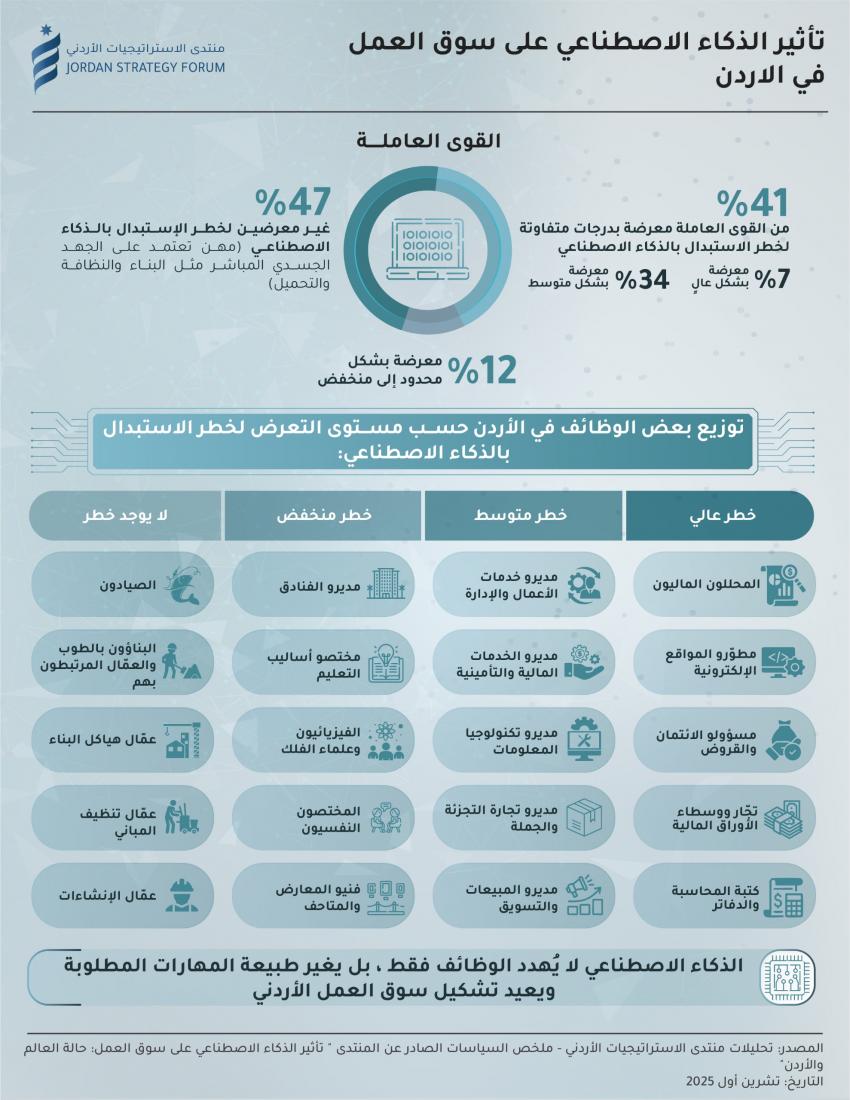 حيث أظهرت نتائج تحليل المنتدى أن ما يقرب 41% من إجمالي العمالة الأردنية تقف اليوم ضمن دائرة التأثر المباشر بتطورات الذكاء الاصطناعي وأدواته، وبدرجات متفاوتة من الخطر، تتراوح بين تعرض عالٍ (7%)، وتعرض متوسط (34%). ما يعني، أن شريحة واسعة من القوى العاملة في الأردن قد تواجه تحولات جوهرية في طبيعة مهامها، أو حتى تهديدًا لشاغلي تلك الوظائف في حال عدم مواكبتهم للمهارات المطلوبة مستقبلًا.