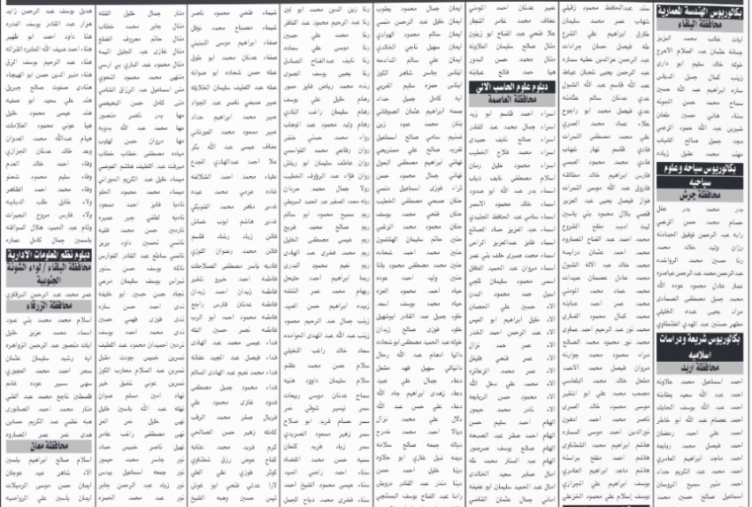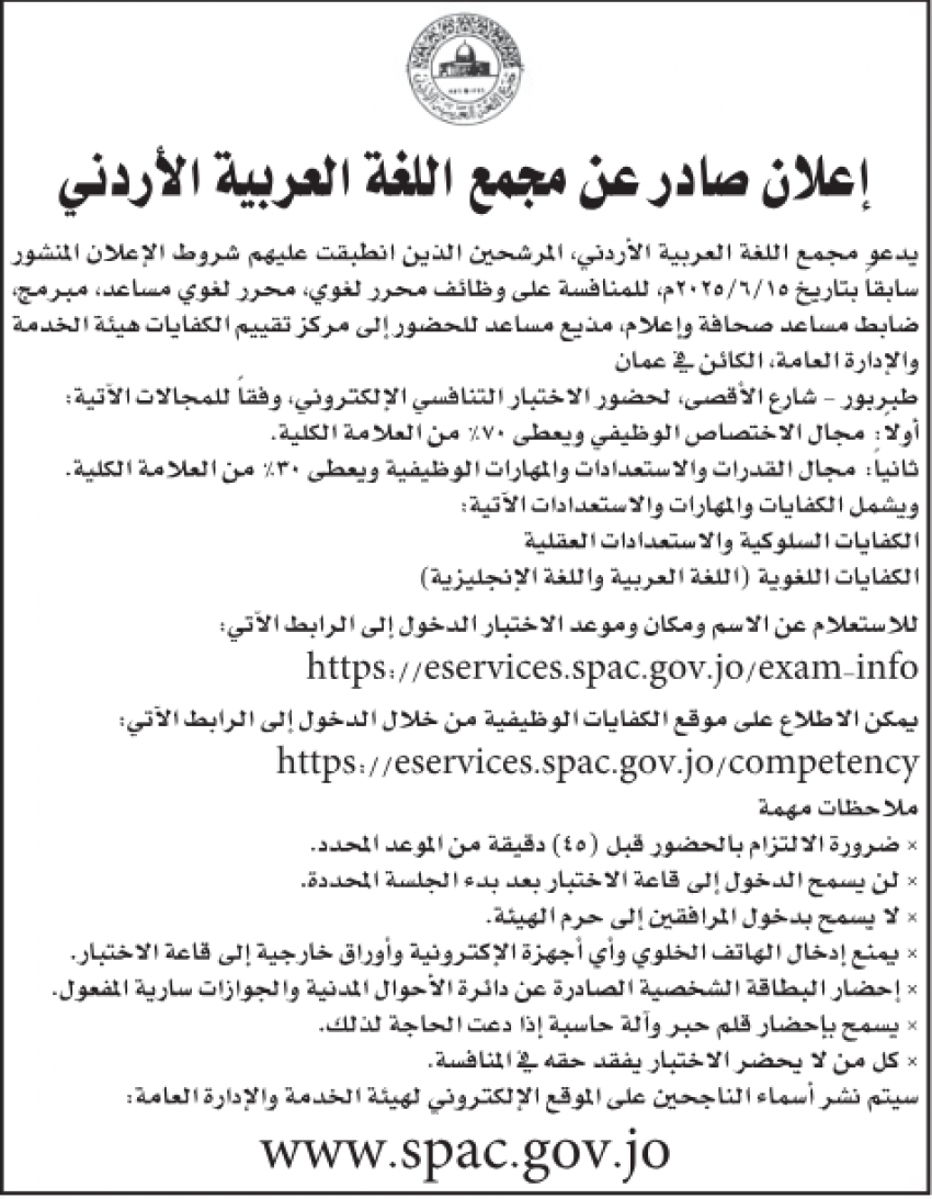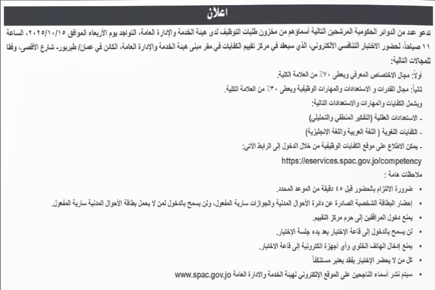 للعلّم - دعت عدد من الدوائر الحكومية المرشحين التالية أسماؤهم من مخزون طلبات التوظيف لدى هيئة الخدمة والإدارة العامة، التواجد يوم الأربعاء الموافق 15/ 10/ 2025، الساعة 11 صباحًا، لحضور الاختبار التنافسي الإلكتروني، الذي سيعقد في مقر مبنى هيئة الخدمة والإدارة العامة، الكائن في عمان/ طبربور - شارع الأقصى.