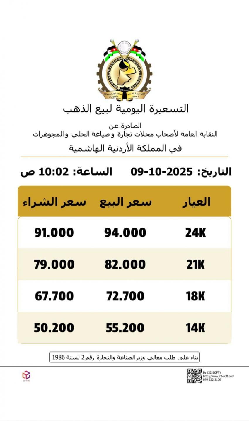 فيما بلغت أسعار بيع غرام الذهب لعيارات 24 و18 و14 في محلات الصاغة، 94 دينارا، 72.7 دينارا، و55.2 دينارا على التوالي.