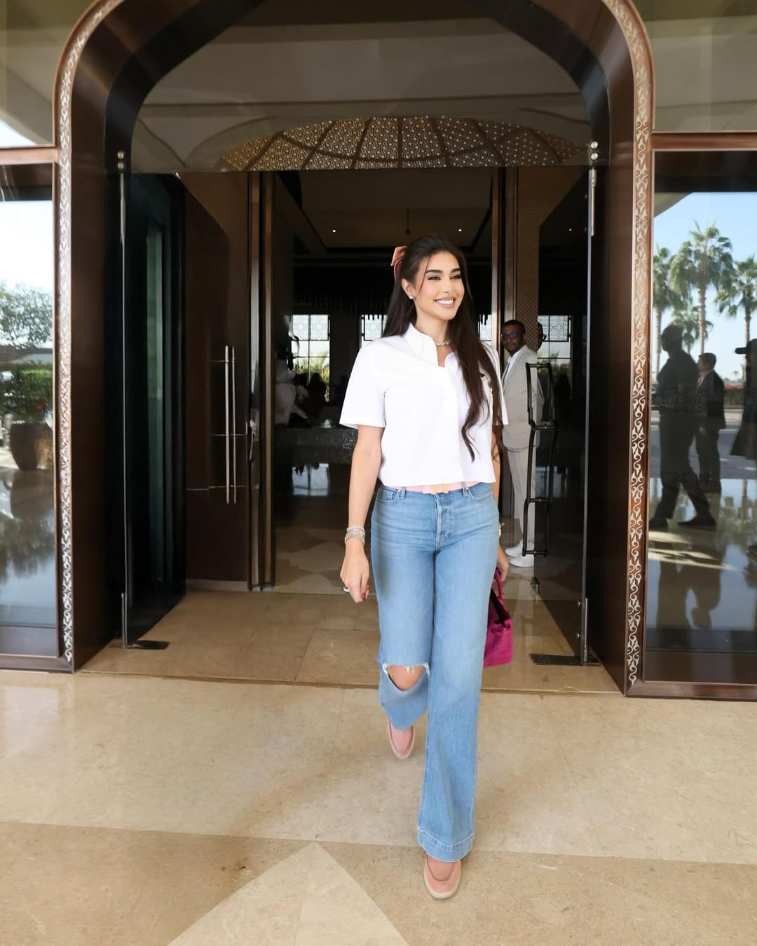 بنطال جينز فاتح بالركبة الممزقة مع قميص أبيض قصير الأكمام، وحزام رفيع زهري متناسق مع الموكاسان المخملي وحقيبة فوشيا وربطة شعر حريرية.