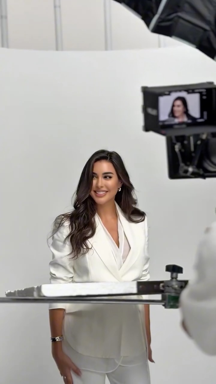 بدلة بيضاء ناعمة بتصميم كلاسيكي بسيط مع بلوزة شفافة تتخطى طول الجاكيت، مع شعر ويفي ومكياج ناعم.