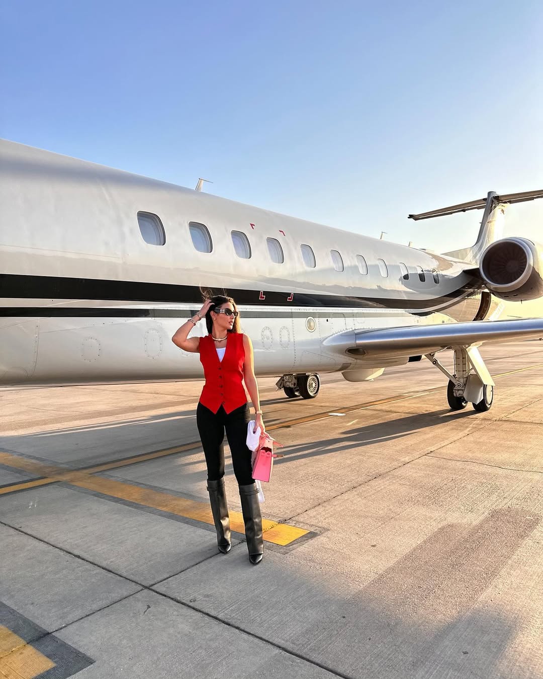ليجن أسود مع بوت عالي وجيليه باللون الأحمر القوي، مع حقيبة بلون زهري وجاكيت خفيف لمواجهة تقلبات الطقس، وزينت الطلة بمجوهرات ذهبية، لتجمع بين الكلاسيكية والعملية.