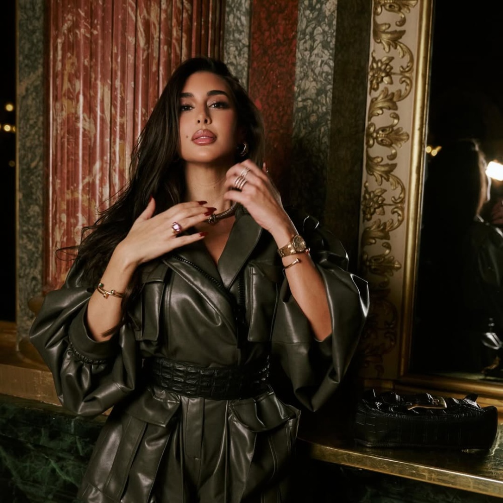 أما المجوهرات، فقد اعتمدت القطع السميكة من الذهب التي أضفت لمسة معاصرة ببريق هادئ، وتركّت شعرها الطويل منسدلاً مع الغرة المنتفخة، فيما جاء مكياجها بلمسات ترابية دافئة تناسب لون بشرتها.