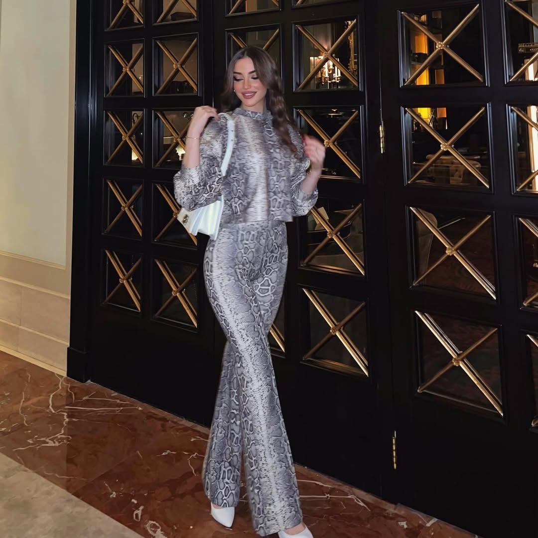 طقم بنقشة جلد الأفعى باللونين الرمادي والأسود، توب قصير بأكمام واسعة وبنطال واسع من الأسفل، مع حذاء كعب مدبب أبيض وحقيبة كتف صغيرة، ما يعكس جرأتها في اعتماد الموضة الرائجة.
