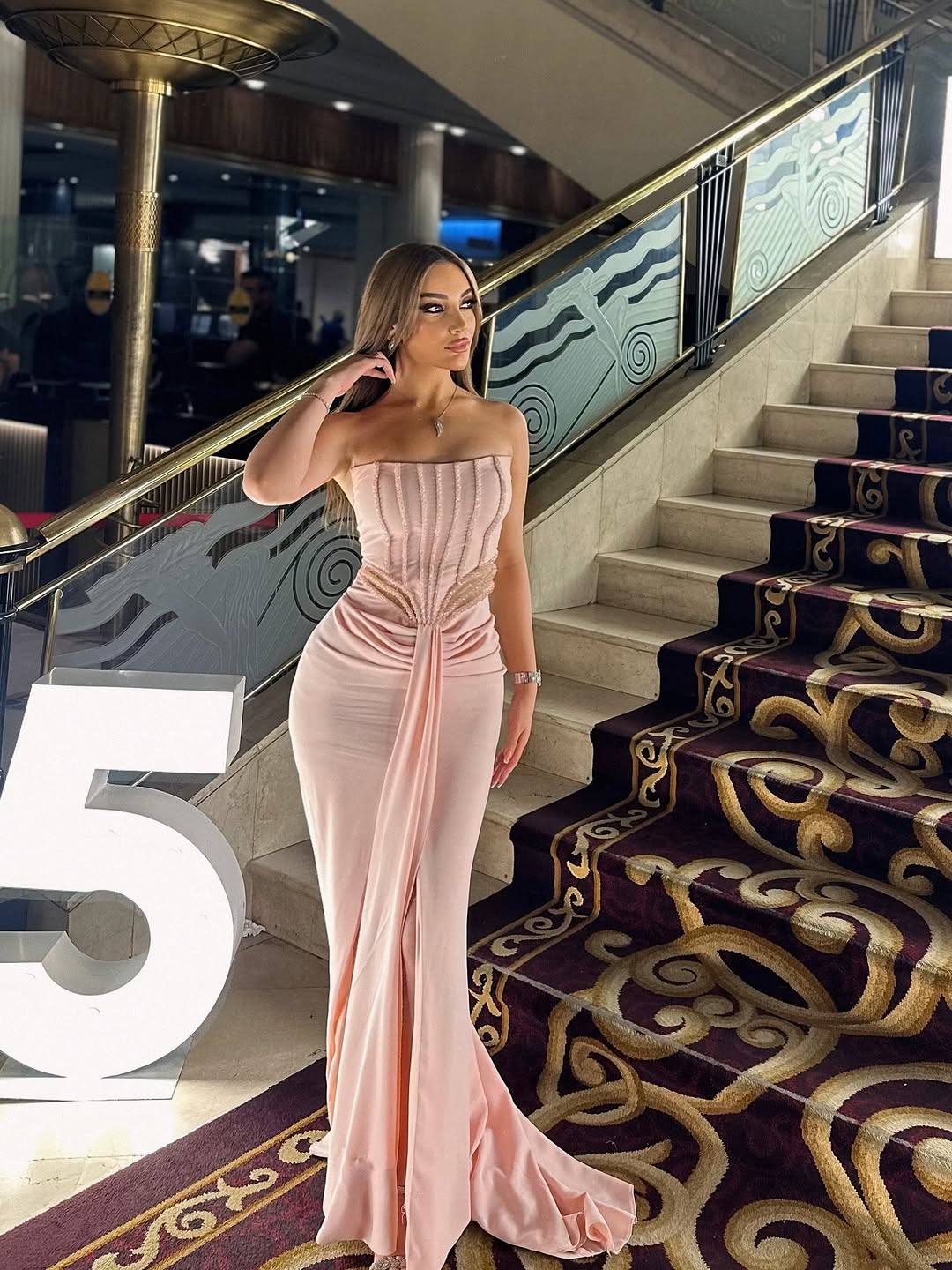 لفتتنا أملي بفستان سهرة بلون النيود الزهري الشفاف من Khanoum Hautecouture&bridal، بقصة حورية البحر الضيقة عند الخصر والمنسدلة باتساع في الأسفل، وتصميم Strapless بقصة صدر على شكل قلب.