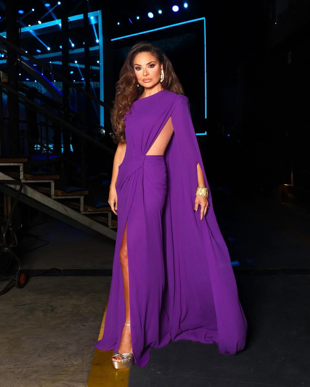 هيلدا خليفة: فستان بنفسيجي كتف واحد مع كم طويل وكاب متدلي خلف ظهرها، فتحة جانبية جريئة، حذاء ميتاليك فضي، شعر مموج.