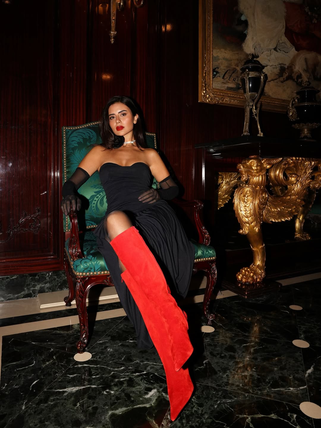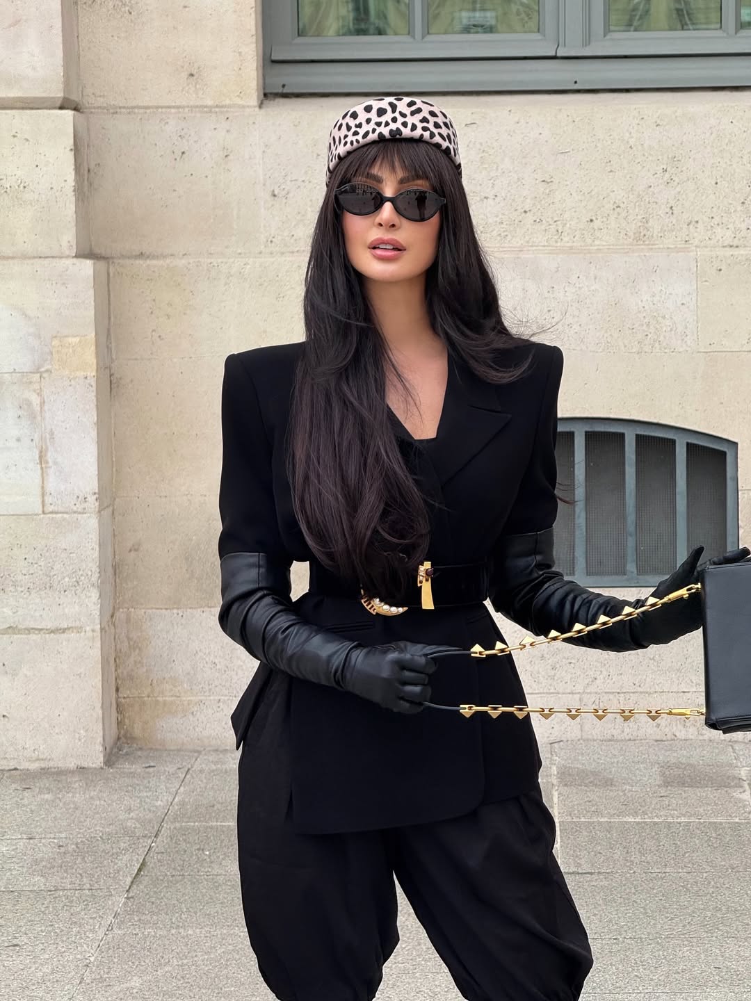 نور الغندور اختارت إطلالة ستريت ستايل كاملة باللون الأسود، كسرت حدته بقبعة بيج منقطة، والقفاز الأسود العالي أضاف لمسة من الرقي العصري، مع تنسيق البوت الطويل وحقيبة اليد الجلدية. بينما ديما الأسدي، التي اعتمدت عدة إطلالات خلال الموسم، نسقت القفازات العالية الشفافة مع فستان سهرة أسود من Magda Butrym، أضاف البوت العالي من المخمل الأحمر وغطاء الجلد اللامع لمزيد من الأناقة والفخامة.