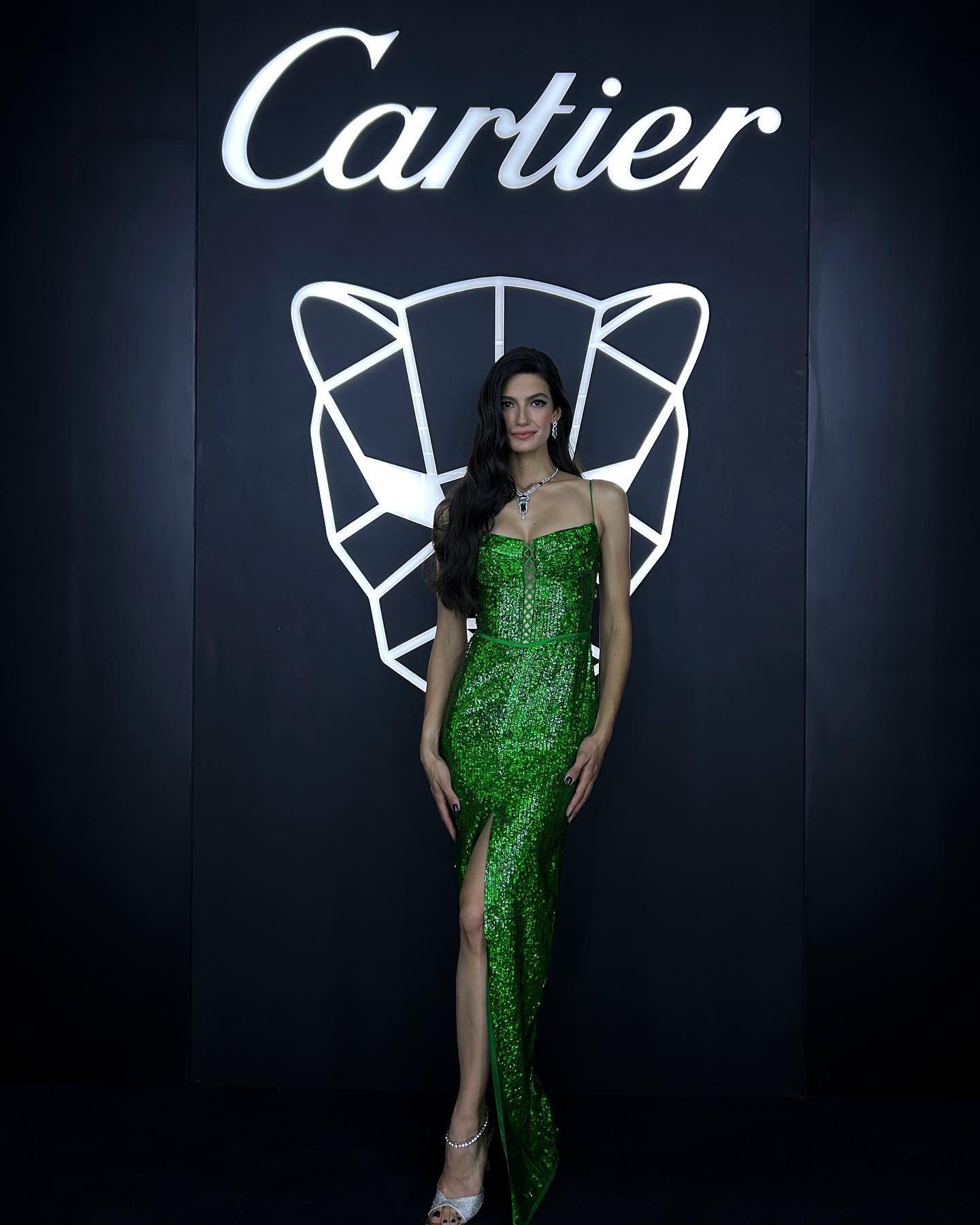 كما تألقت في فعالية لدار كارتييه بفستان بصيحة الحورية من تصميم Maison Yeya، تميز بالأكتاف المكشوفة والخصر المحدد بتصميم الكورسيه، ونسقته مع عقد وأقراط من كارتييه أضافا لمسة فخامة كلاسيكية.