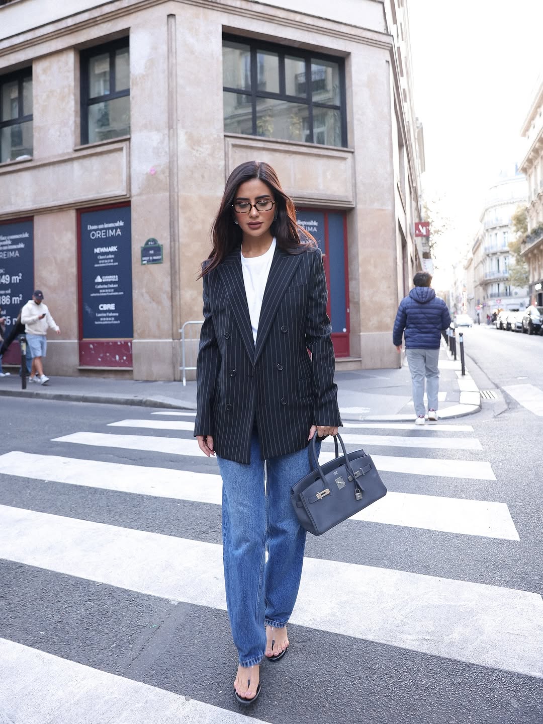 تألقت الفاشينيستا ديما الأسدي خلال أسبوع الموضة في باريس ببليزر أسود مخطط من YSL بأسلوب ذكوري فضفاض، نسقته مع توب أبيض وبنطال جينز واسع من 12 Storeez. الإطلالة جمعت بين العفوية والفخامة، وأكملتها بحقيبة Birkin من Hermès وحذاء بكعب رفيع من Magda Butrym، لتمنحنا درساً في تنسيق البليزر بأسلوب “سمارت كاجوال” أنيق ومثالي للخريف.