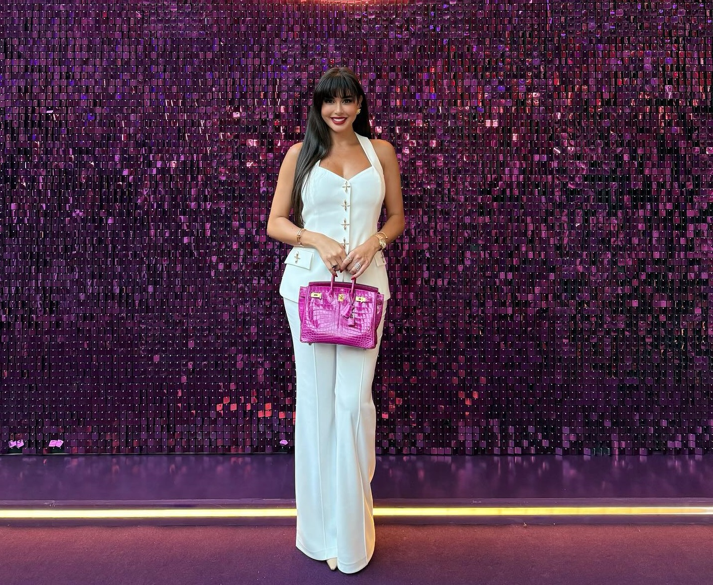 واصلت ياسمين استعراض أناقتها بمجموعة من الإطلالات المتنوعة التي تبرز أسلوبها العصري الفخم. ففي إحدى الفعاليات، أطلت بطقم أبيض أنيق بقصة ضيقة عند الخصر وأزرار ذهبية على الصدر أبرزت رشاقتها بأسلوب راقٍ، ونسقته مع حقيبة بيركين صغيرة باللون الفوشيا أضفت حيوية ولمسة لافتة إلى المظهر.