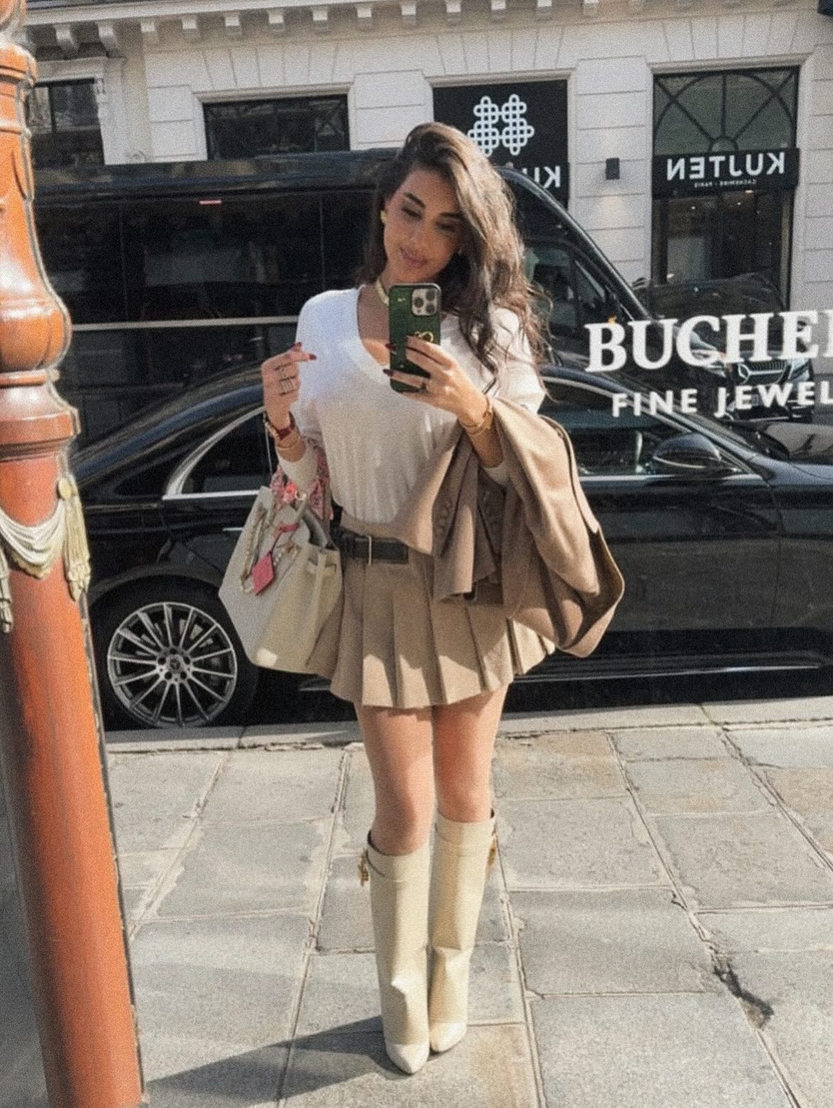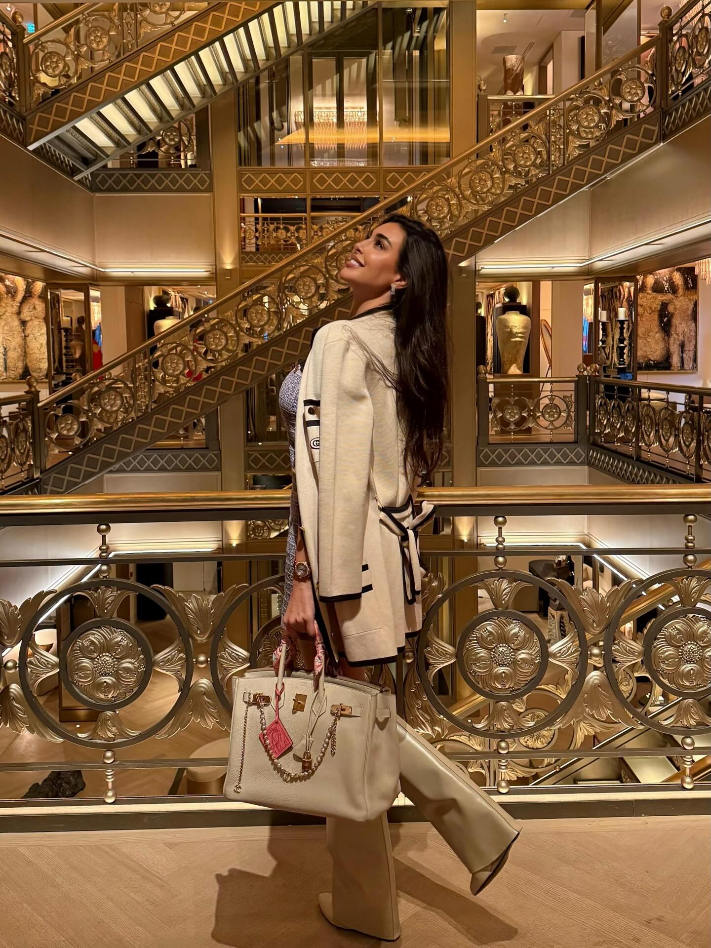 نسّقت الفستان مع جاكيت بيج فاتح مزين بحواف سوداء دقيقة أضفت عليه لمسة كلاسيكية فاخرة، من توقيع جوتشي (Gucci). وأكملت إطلالتها بـ حقيبة بيركين فاخرة باللون العاجي مزينة بسكارف حريري وسلسلة ذهبية، مع بوت جلدي من جيفنشي (Givenchy)، وساعة براقة فاخرة. النتيجة كانت إطلالة تجمع بين النعومة الأنثوية والفخامة الفرنسية الراقية.