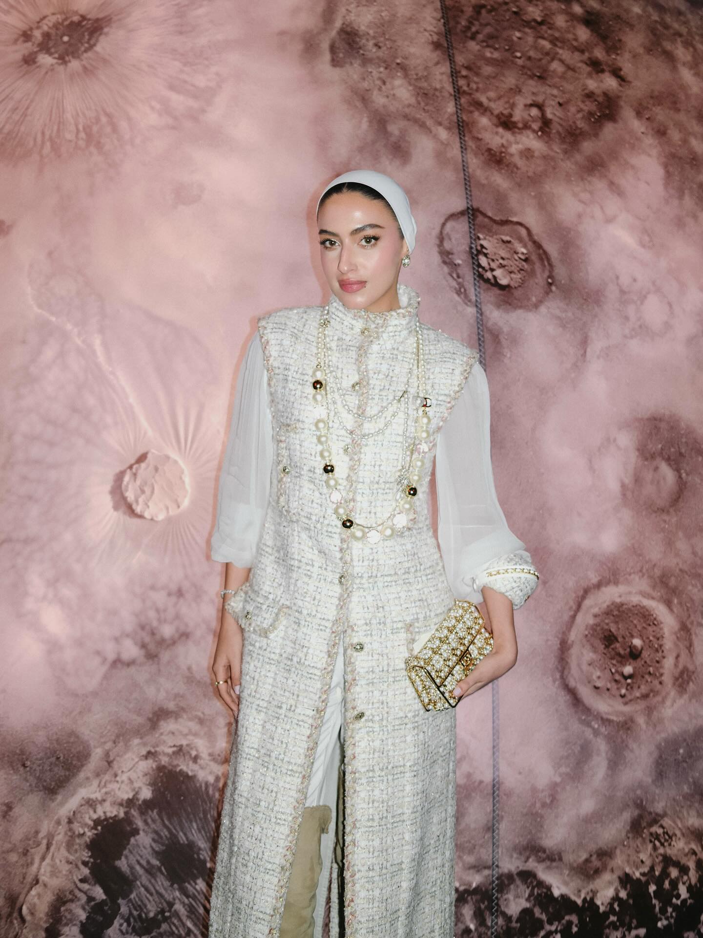 خلال تواجدها في أسبوع الموضة في باريس، لفتت يارا الأنظار بإطلالات غاية في التميز، حيث مزجت بين الكلاسيكية الفرنسية واللمسة الشرقية المحافظة. في إحدى إطلالاتها، تألقت بطقم عاجي من قماش التويد الفاخر من شانيل، تميّز بمعطف طويل بلا أكمام فوق بلوزة شفافة ذات أكمام منفوخة قليلاً، ما أضفى بعدًا أنثويًا راقيًا. الحقيبة الصغيرة المطرزة بالخرز الذهبي وسلسلة اللؤلؤ الطويلة منحت الإطلالة لمسة من البريق الفاخر، بينما كان الحجاب الأبيض البسيط بمثابة لمسة نهائية تعكس التوازن والجمال النقي.