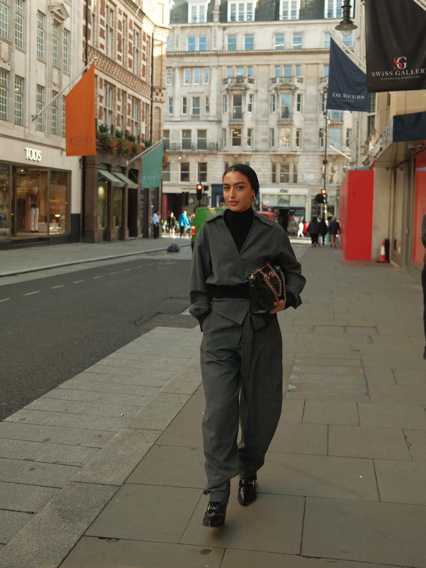 وفي إطلالة أخرى أكثر رسمية، تألقت ببدلة رمادية واسعة تتكون من جاكيت مستقيم وبنطال فضفاض عالي الخصر، اختارت معها توبًا أسود برقبة عالية ليضفي لمسة من العمق والأناقة الكلاسيكية، وأكملت المظهر بحقيبة يد بنية مزينة بتفاصيل ذهبية وحذاء أسود لامع. هذه الإطلالة جسدت توازنها الدقيق بين العملية والفخامة.