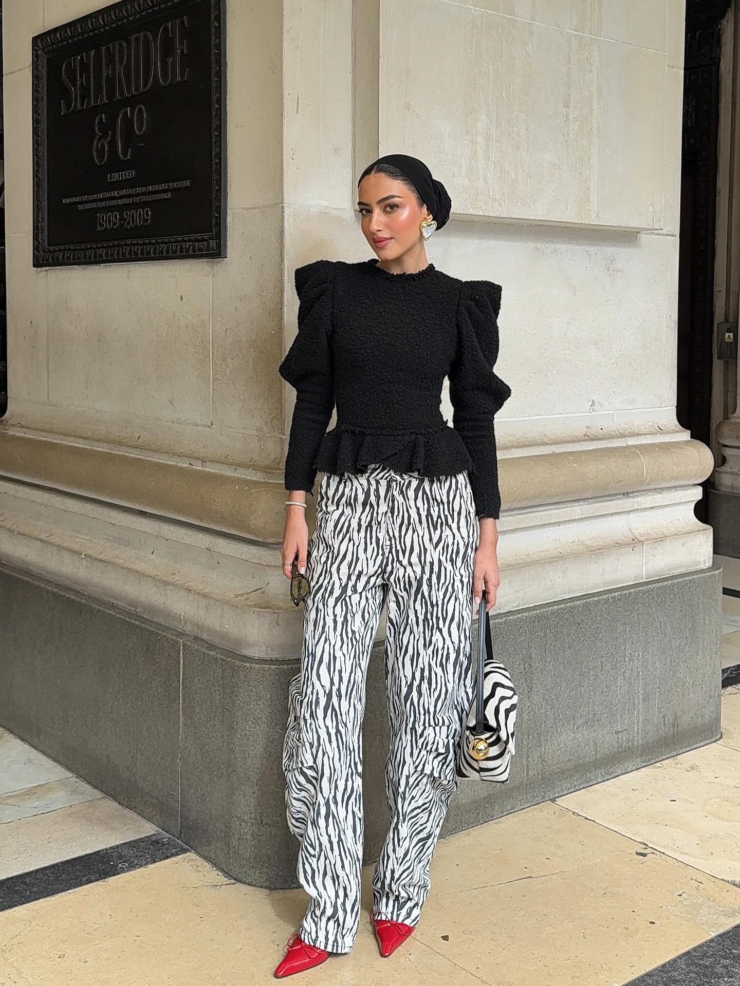 من أكثر الإطلالات التي نالت إعجاب المتابعين كانت تلك التي ارتدت فيها بلوزة سوداء بأكمام منفوخة ضيقة عند الخصر مع بنطال بنقشة الحمار الوحشي، فمزجت بين الجرأة والأناقة، وأضافت حقيبة بالنقشة نفسها وحذاء أحمر لامعًا منح الإطلالة حيوية لافتة. أما الحجاب الأسود فحافظ على التوازن اللوني العام.