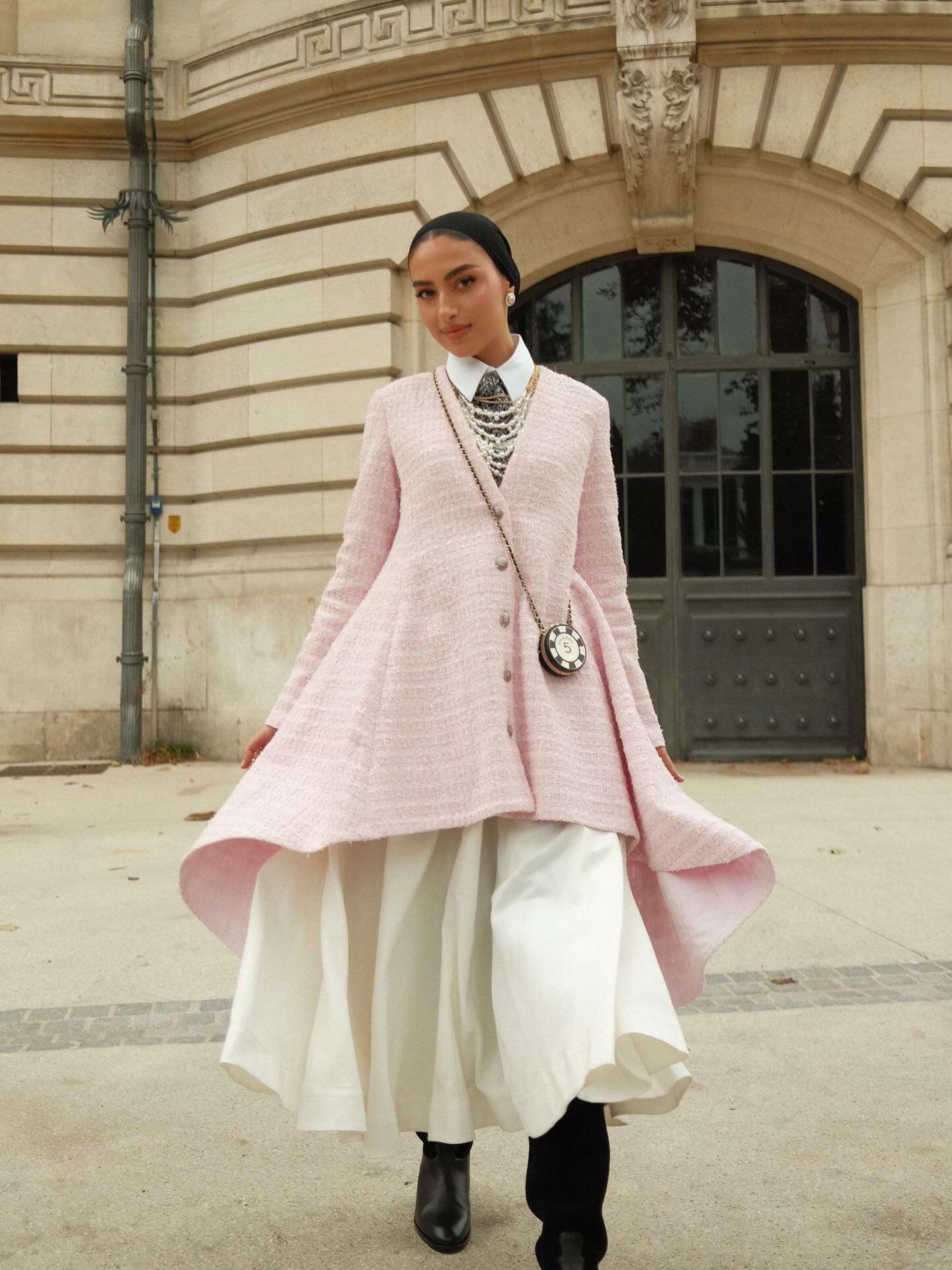 وفي إطلالة أخرى، ظهرت يارا بمعطف وردي فاتح من شانيل بتصميم غير متماثل، أضاف حركة انسيابية وأناقة حالمة، نسقته مع قميص أبيض وتنورة واسعة باللون ذاته. هذه الإطلالة جمعت بين الرقي والأنوثة ببراعة، واختارت حجابًا أسود بسيطًا ليكسر الألوان الفاتحة بتباين جذاب ومتوازن.