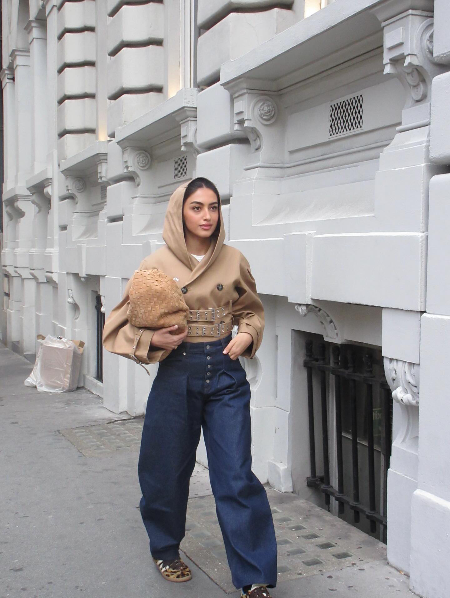 كما أبهرت متابعيها بإطلالة مميزة تتكون من جاكيت بيج واسع الأكمام مزود بحزام عريض عند الخصر، نسقته مع بنطال جينز أزرق داكن عالي الخصر، وحقيبة كبيرة باللون البني، فيما منح الحجاب المتناسق درجات دافئة مريحة للعين. واختارت حذاء بنقشة الفهد لتضفي لمسة من الجرأة الفاخرة.
