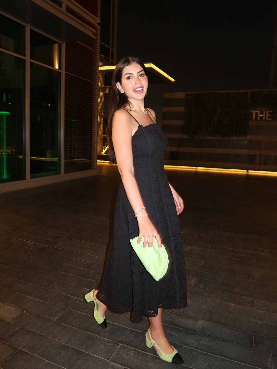 ارتدت أريج نشاشيبي فستانًا كلاسيكيًا أسود، مع قصة ميدي واسعة من الدانتيل، وانتعلت حذاء أخضر وأسود متناسق مع الكلاتش، مكمّلة إطلالتها بشوكر مرصع وشعر مالس منسدل، لتبرز كيف يمكن دمج لمسة صاخبة مع الطابع الكلاسيكي الداكن للخريف.