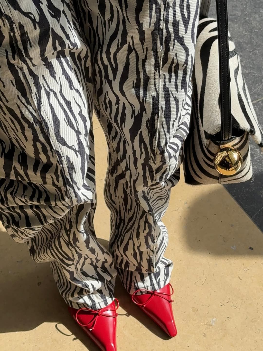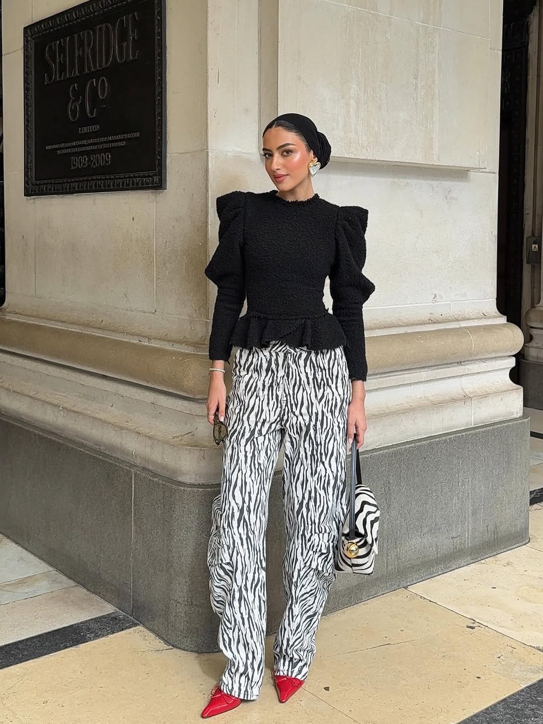 اختارت يارا النملة إطلالة خريفية صباحية بالأبيض والأسود، بنطال واسع بطبعة الزيبرا مع توب أسود بأكتاف منتفخة وحواف كشكش، مع حقيبة يد بنفس نقشة الزيبرا. أما لمسة الجرأة فجاءت من حذاء مدبب باللون الأحمر الناري، ليضيف حيوية للطقم ويكسر حياده، مع غطاء رأس أسود أكمل الإطلالة بأسلوب أنيق وراقي.