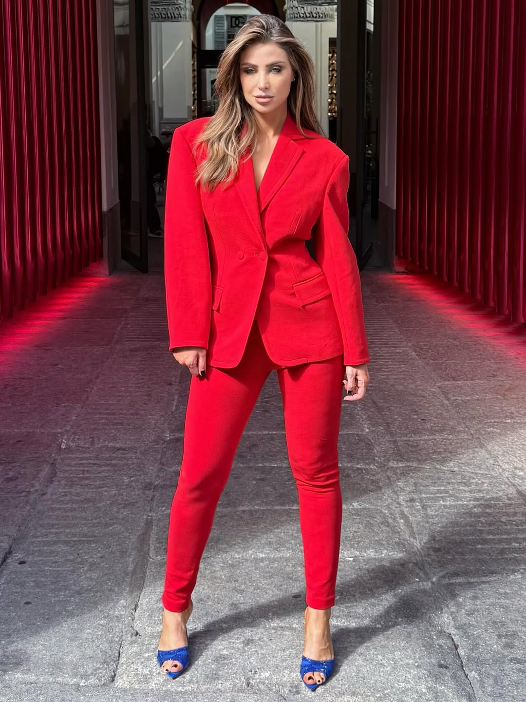 اختارت أنابيلا هلال بدلة كلاسيكية حمراء من Magda Butrym، بتصميم ضيق يلامس الكاحل وجاكيت عريض بأزرار مزدوجة، وكسرت اللون الجريء بحذاء أزرق ملكي مرصع، مع شعر ماسل منسدل دون إضافات زائدة، لتجسد التباين الجريء بين الألوان بطريقة ملفتة.