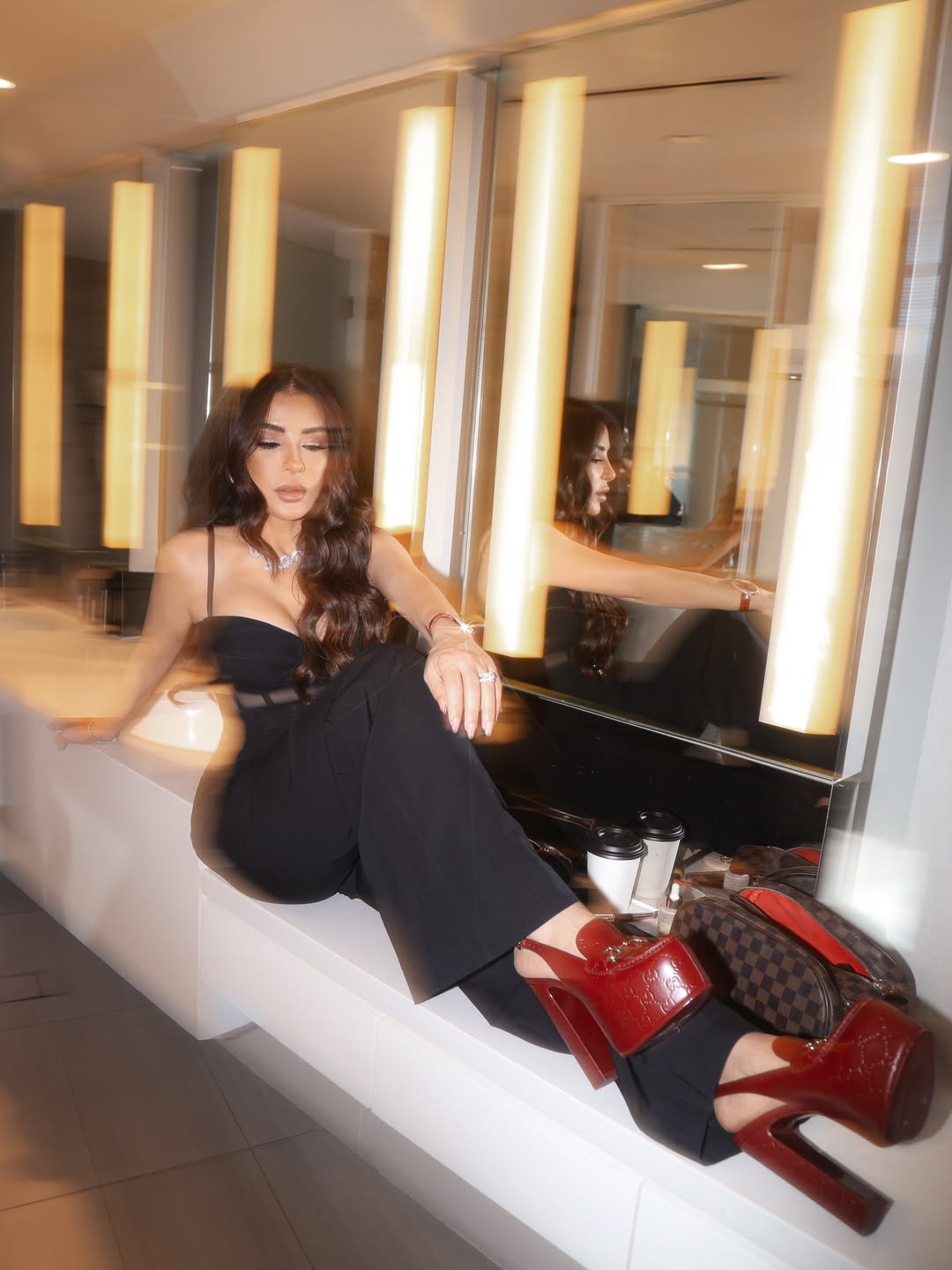 ارتدت ماغي بوغصن جمبسوت أسود بأرجل واسعة وخصر عالي مع كورسيه شفاف وحمالات رفيعة، وانتعلت حذاء بلاتفورم برغندي من دار Gucci منقوش برموز الدار، متناسق مع ساعة اليد المرصعة ومجوهرات Yeprem، لتكون الإطلالة مثالاً على تنسيق الأحذية الجريئة مع القطع السوداء الكلاسيكية.