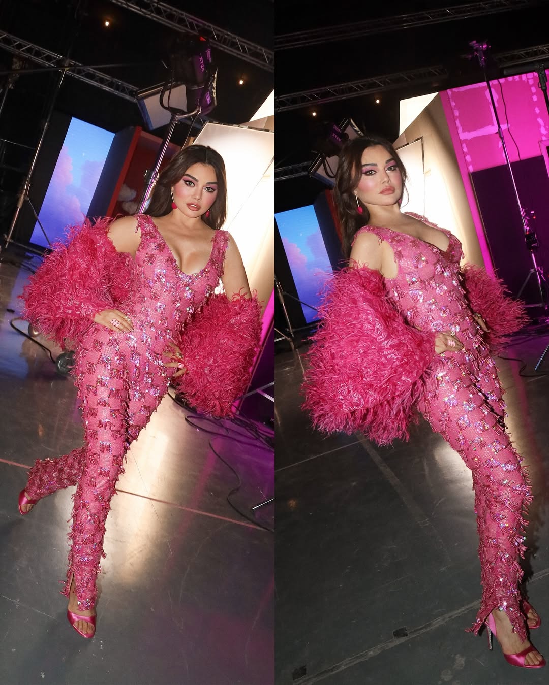 خطفت هيفاء وهبي الأنظار بفستان بليزر فوشيا من توقيع رامي قاضي، بأكمام عريضة مغطاة بالريش وظهر مكشوف، مع ذيل طويل مزين بالريش، وانتعلت صندل حريري فوشيا مطابق، لتكتمل الإطلالة بمزيج من الجرأة والأنوثة المشرقة، مع شعر مموج انسيابي.
