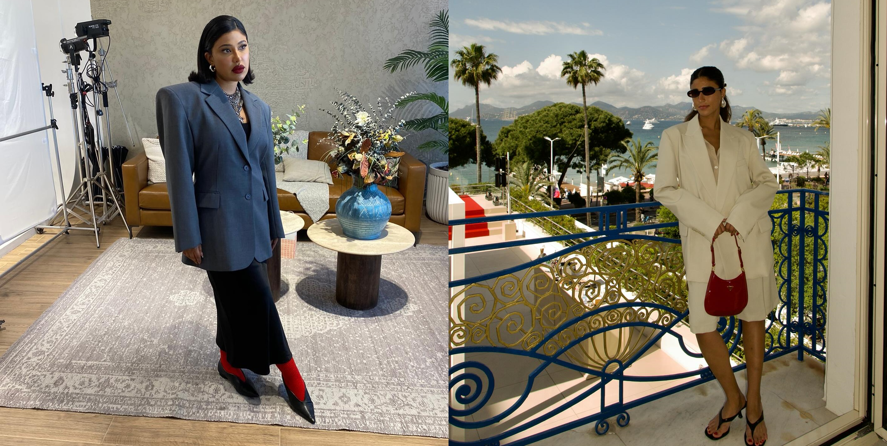 أما ليلى عبد الله فقد فضلت إطلالة أكثر هدوءاً وأناقة ببدلة باللون البيج المائل إلى الرمادي، تألفت من بليزر فضفاض بأكتاف بارزة وبنطال واسع الساقين ينسدل بانسيابية تعكس فخامة التصميم. أضافت الحقيبة المزخرفة بتفاصيل دقيقة لمسة أنثوية ناعمة، لتمنح المظهر توازناً بين الحداثة والكلاسيكية الراقية.