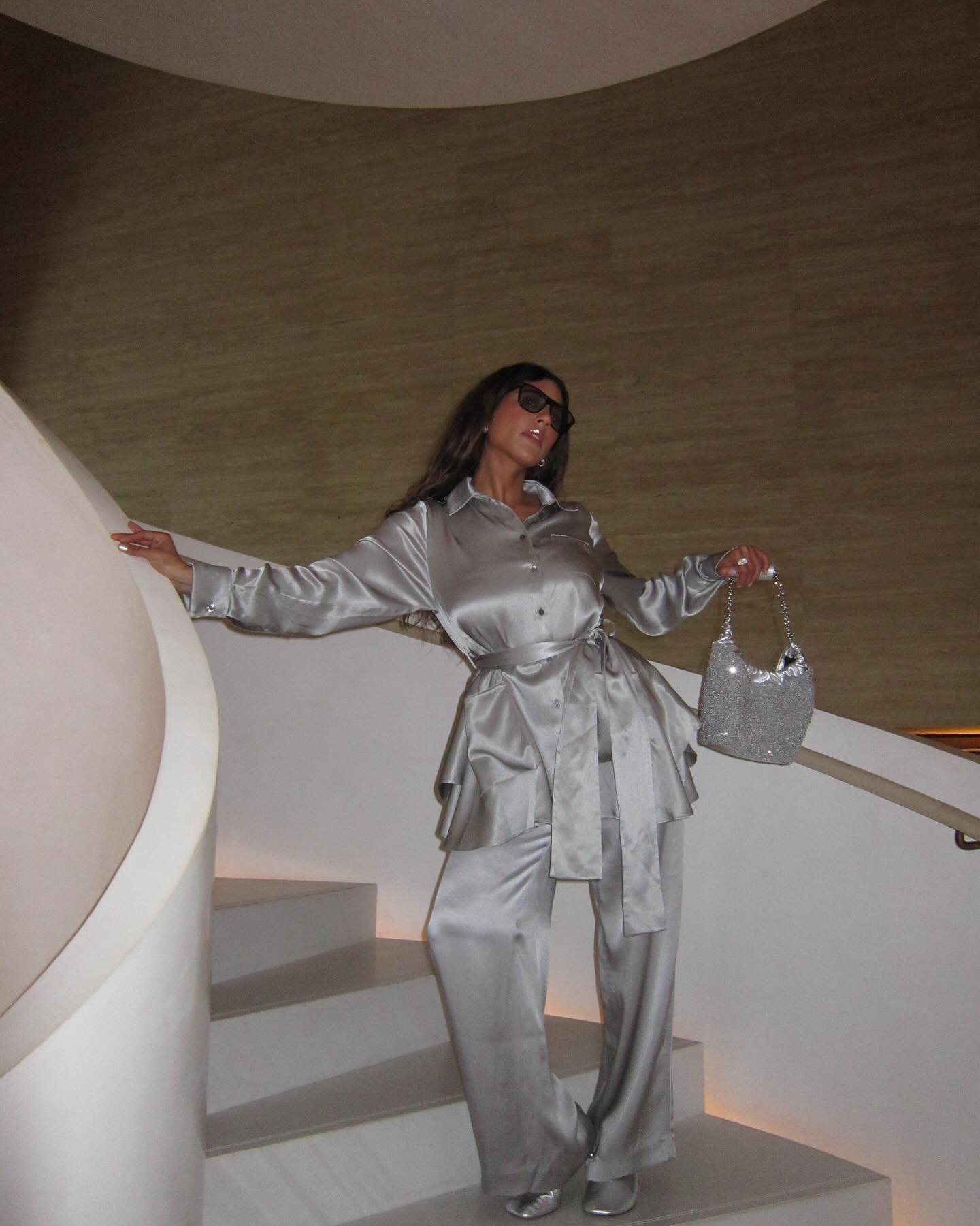 أما ليلى عبد الله فقد خطفت الأنظار بطقم حريري فضي لامع مكوَّن من قميص بأكمام واسعة وبنطال فضفاض يمنحها مظهراً انسيابياً وراقياً. الحزام القماشي أبرز خصرها برقة، فيما أضافت الحقيبة المرصعة بالكريستال بريقاً فاخراً.