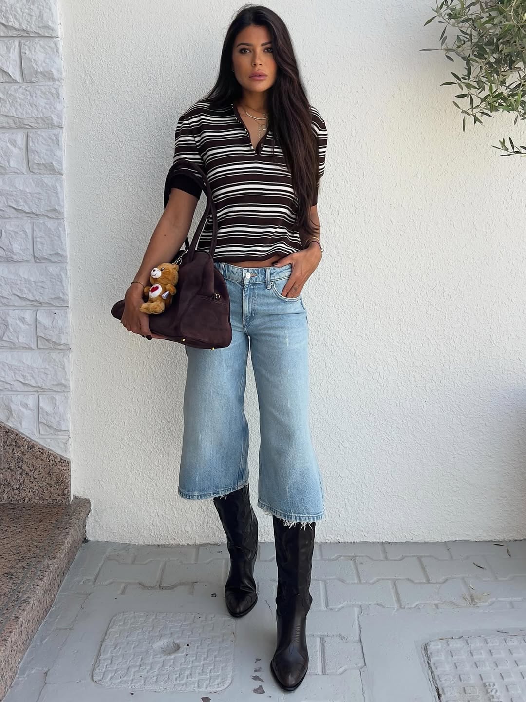 أما العنود بدر، فاختارت إطلالة صباحية أنيقة مع بنطال قصير من الجينز الفاتح، نسقته مع توب مقلم بألوان البني والأبيض وأكمام قصيرة، وأكملت الإطلالة بحقيبة كتف كبيرة من المخمل البني وبوت كاوبوي أسود، مع عقد رقيق وتسريحة شعر منسدلة، مما أضفى على المظهر توازنًا بين الراحة والأناقة.