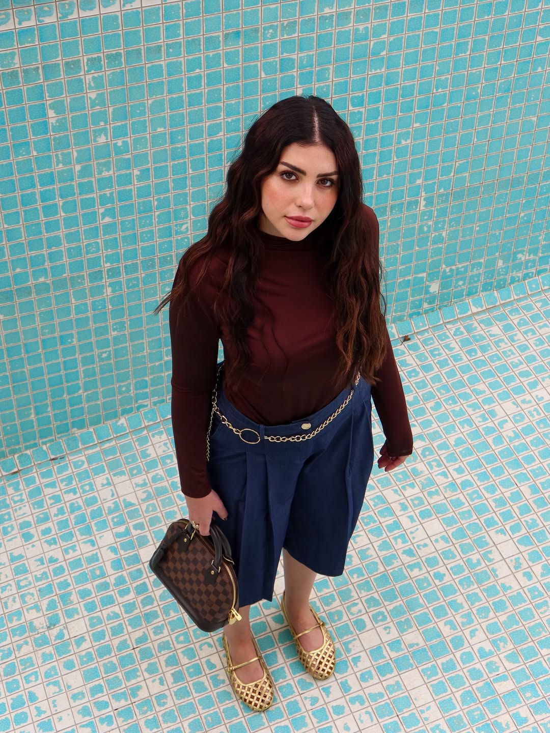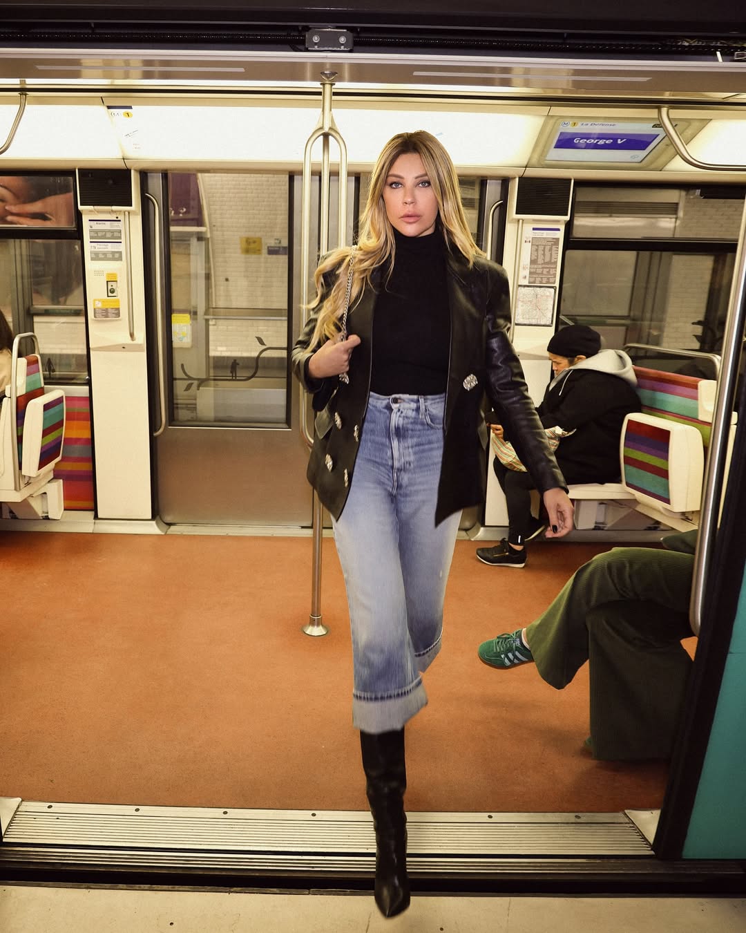 ظهرت كارلا حداد بإطلالة خريفية عصرية في باريس، مزجت فيها بين الجلد والبنطال القصير من الجينز الفاتح بأرجل واسعة وخصر عالٍ، مزين بأطراف مثنية تجاوزت الركبة قليلًا. نسقت كارلا مع بلوفر أسود وبليزر جلدي مزين بخط مزدوج من الأزرار، وأكملت المظهر بحذاء بوت عالي أسود وحقيبة متناغمة، بينما تركت شعرها منسدلًا بانسيابية تعكس الطابع العصري والعفوي.