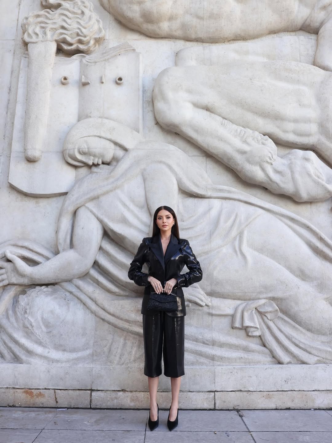 تميزت ناتالي فنج بإطلالة من دار إيلي صعب، تضمنت بدلة قصيرة وواسعة من الترتر الأسود، مع جاكيت مجسم بياقة وحرير فاخر، وزيّنت الإطلالة بحذاء مدبب وحقيبة لامعة، بينما اكتفت بالأقراط والخواتم كإكسسوارات، لتظهر بأسلوب أنيق وفخم يلائم المناسبات الخاصة والخروجات المسائية.