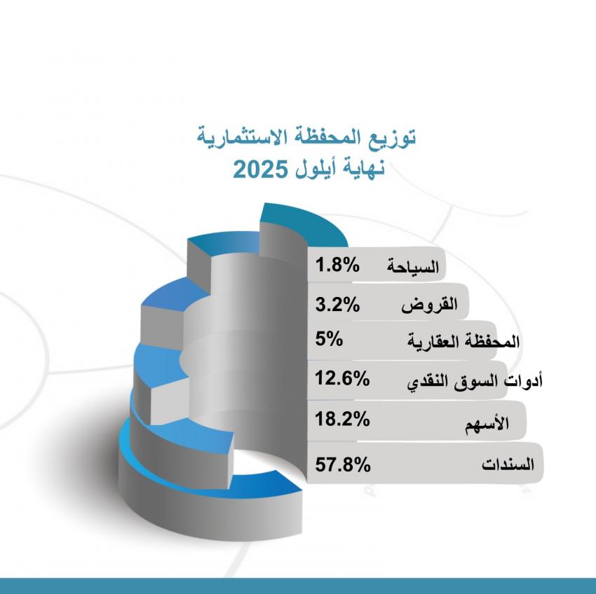 وتوزعت موجودات محافظ الصندوق بشكل رئيسي على محفظة السندات بنسبة 57.8%، ومحفظة الأسهم بنسبة 18.2%، وأدوات السوق النقدي 12.6%، والاستثمارات العقارية 5%، ومحفظة القروض 3.2%، والاستثمارات السياحية 1.8%.