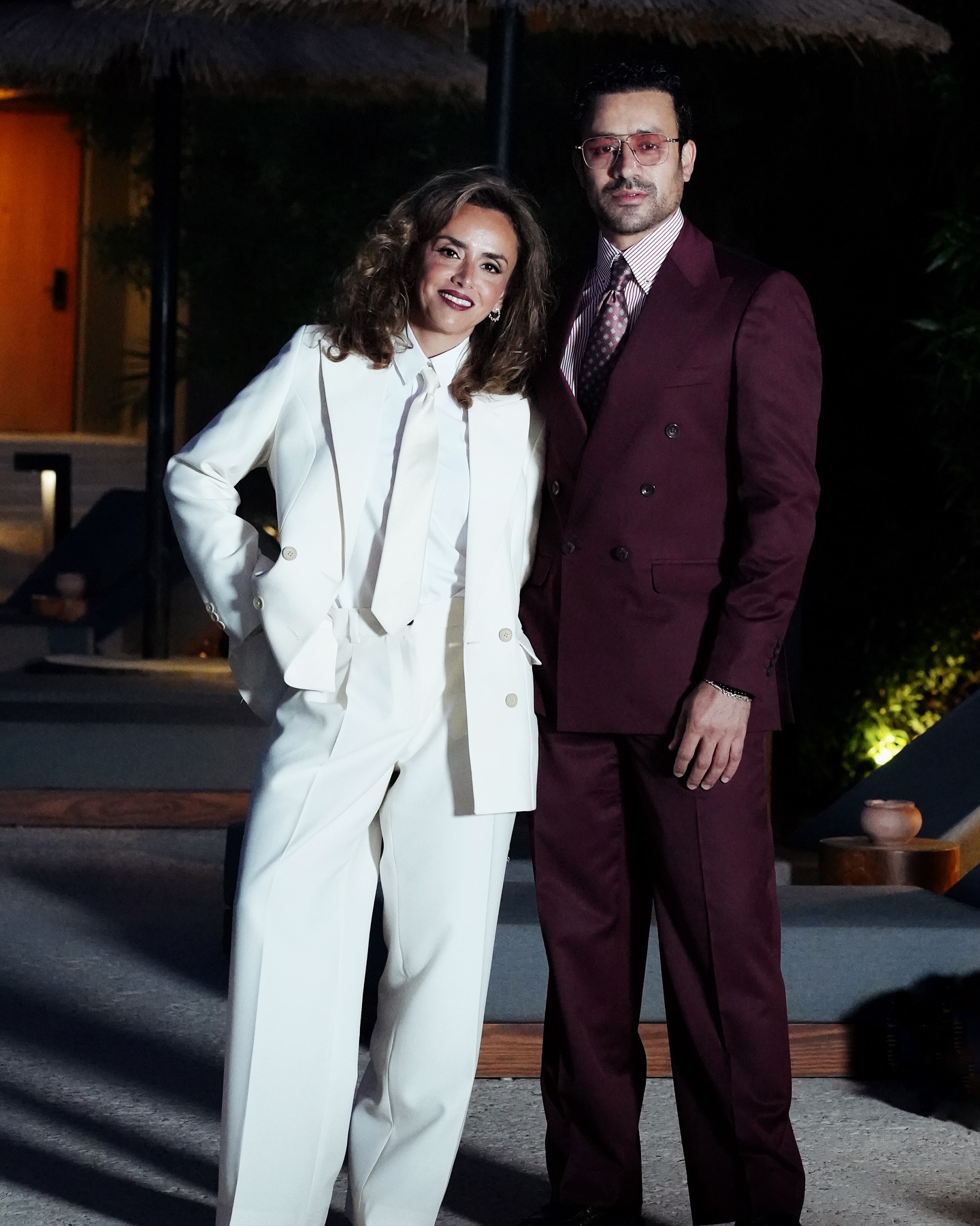 اعتمدت بدلة من توقيع MR.TUXEDOS باللون الأبيض مؤلفة من بليزر بأزرار ذهبية وبنطال واسع عالي الخصر، ونسقتها مع قميص وربطة عنق بنفس اللون، فبدت بإطلالة تجمع بين الطابع الكلاسيكي والعصري.