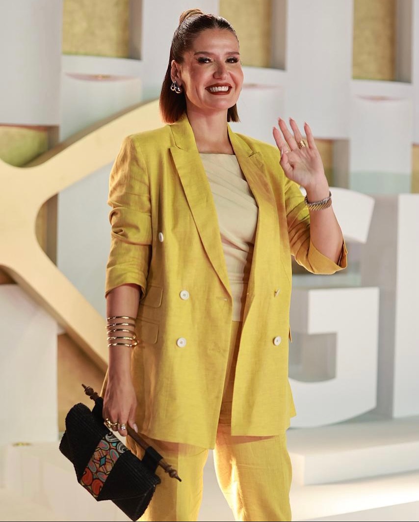 لفتت النجمة المصرية الأنظار في مهرجان الجونة ببدلة صفراء فاتحة مكونة من بليزر طويل وبنطال واسع، نسقتها مع بلوزة بيج وإكسسوارات ذهبية زينتها بأناقة، وأضافت حقيبة سوداء بنقوش ملونة لمسة عصرية مبهجة.