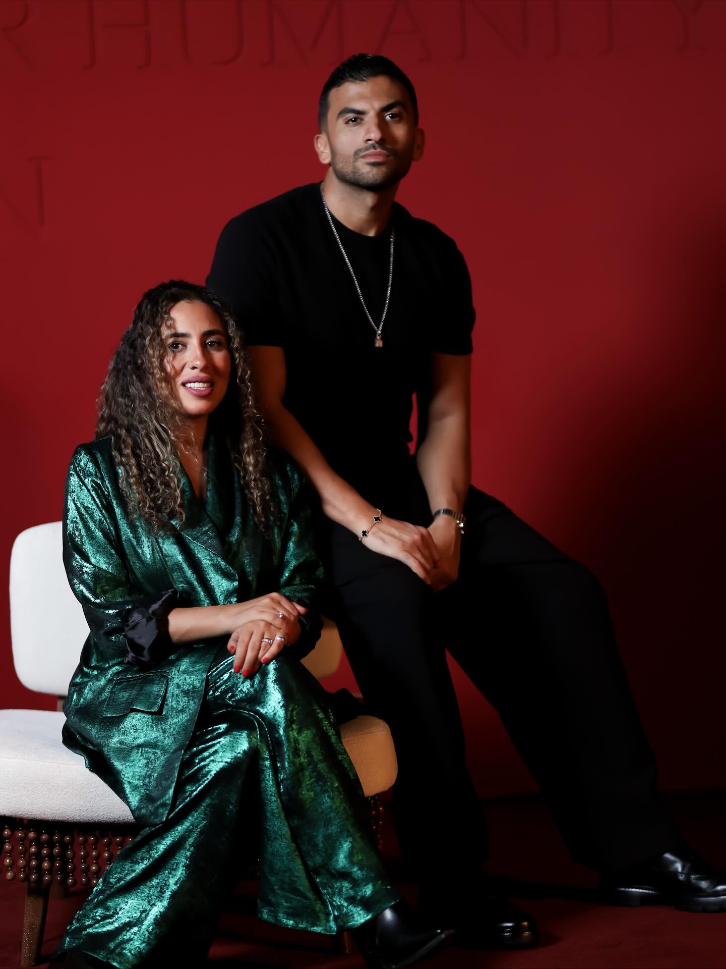 ظهرت ببدلة باللون الأخضر الميتاليك، ذات قصة واسعة عكست جرأتها وتميزها، ونسقتها مع بلوزة سوداء بسيطة لتضفي توازناً أنيقاً على الإطلالة.