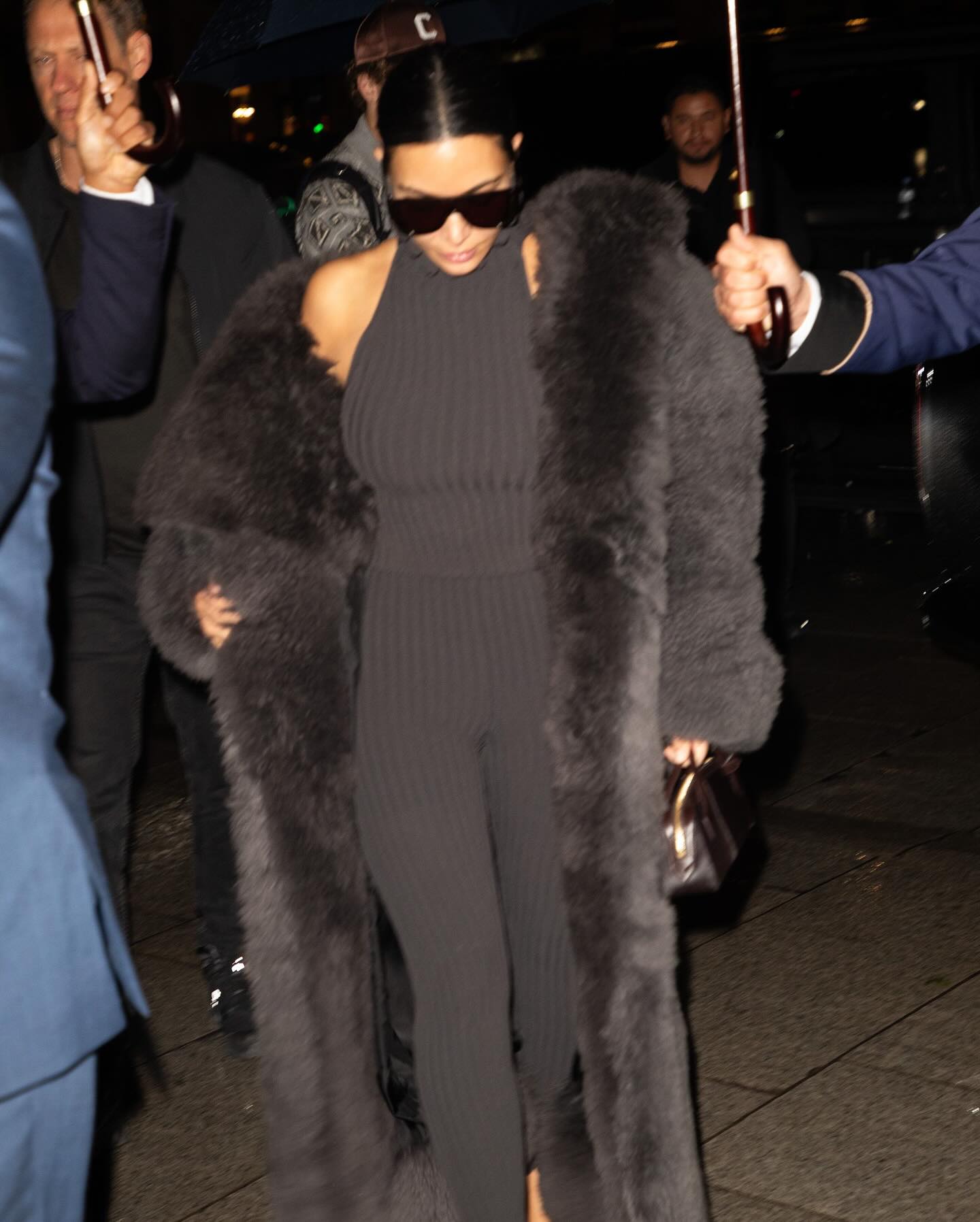 جمبسوت أسود من ALAÏA مع معطف فرو طويل، ونظارات كبيرة، لمظهر جريء وأنيق.