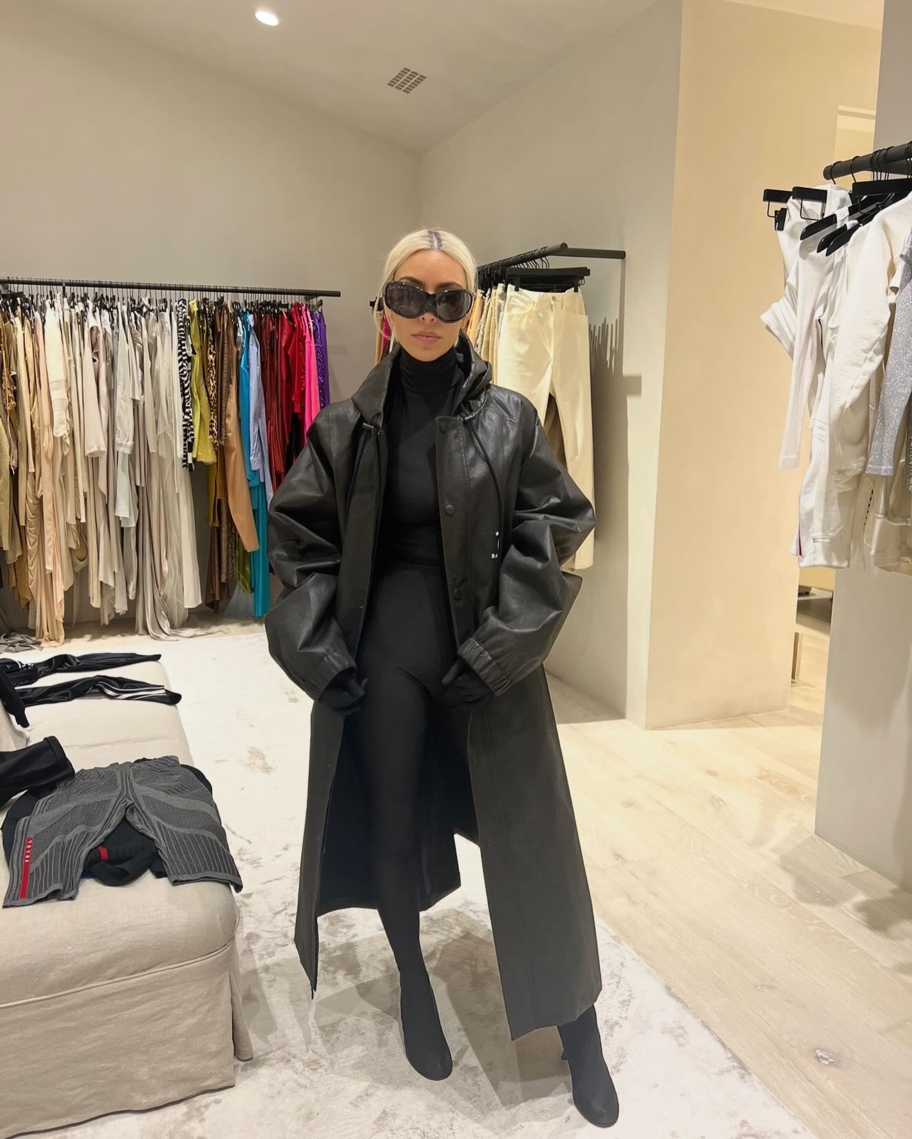 معاطف جلدية من Phoebe Philo وBalenciaga بتصاميم عصرية وأكتاف بارزة، نسقتها مع جمبسوت أسود ونظارات شمسية كبيرة.