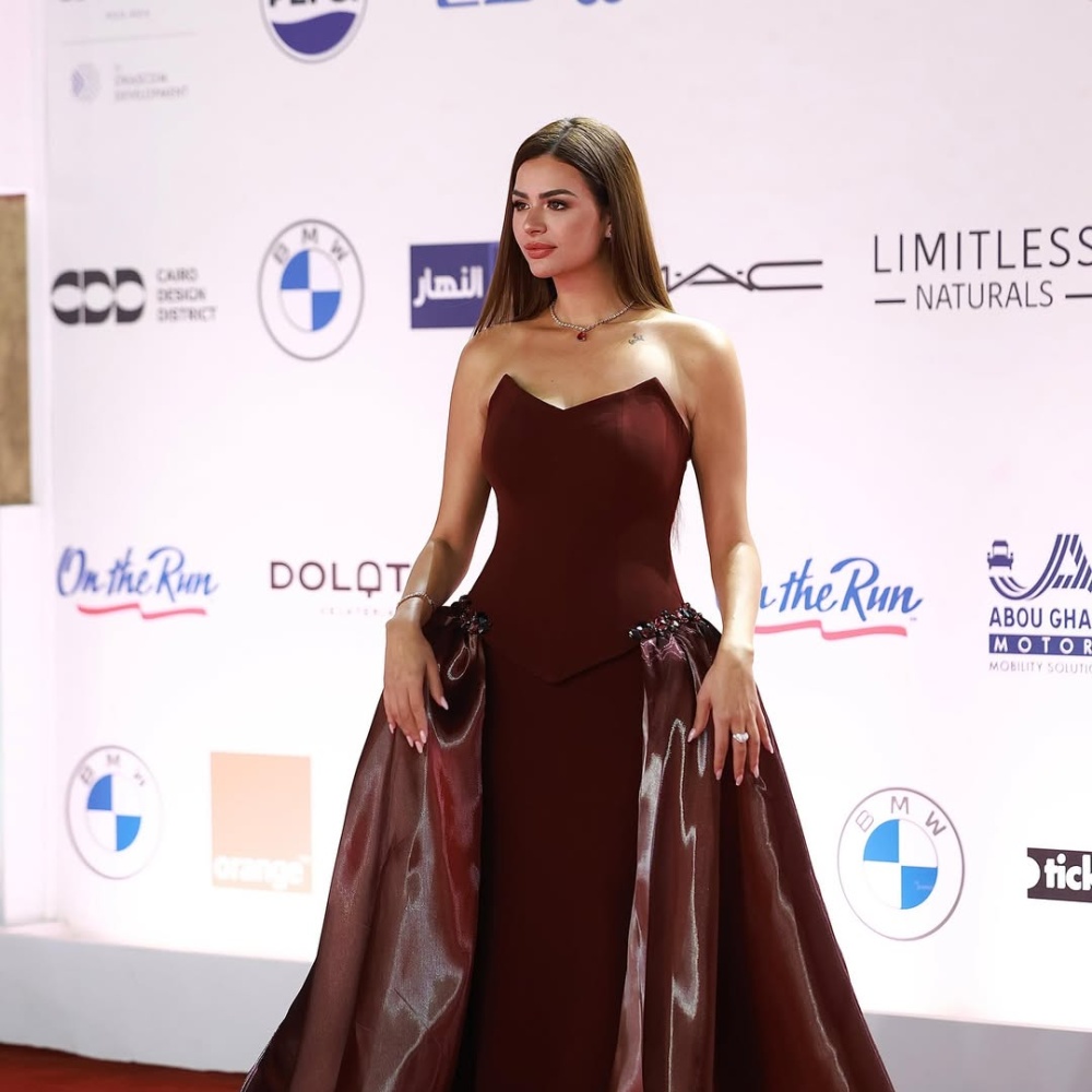 تألقت هنادي مهنا بفستان بني مجسم بقصة كورسيه وتنورة ماكسي، مزين بتطريز كريستالي وجوانب حريرية منسدلة بثنيات فخمة. اعتمدت الشعر المالس والمجوهرات الماسية لإكمال أناقتها.