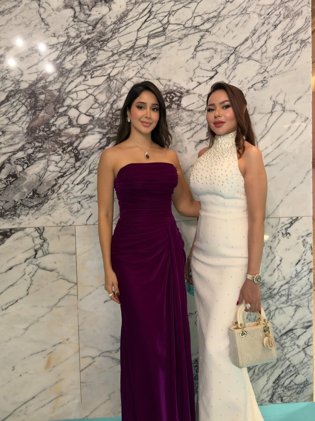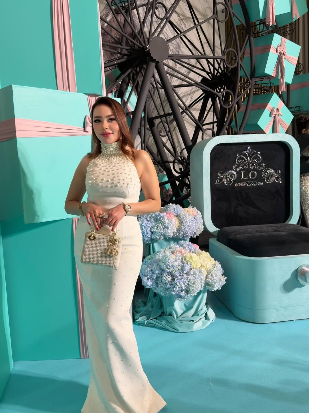 ظهرت أسما بفستان سهرة طويل باللون الأبيض، بقصة مجسمة وياقة هالتر عالية، مزين بحبات اللؤلؤ التي تقل كثافتها للأسفل. حملت حقيبة كريستالية من Dior، وترك شعرها منسدلاً، مع أقراط صغيرة لإكمال الإطلالة الرقيقة.
