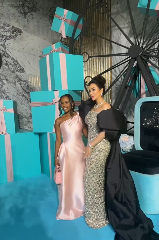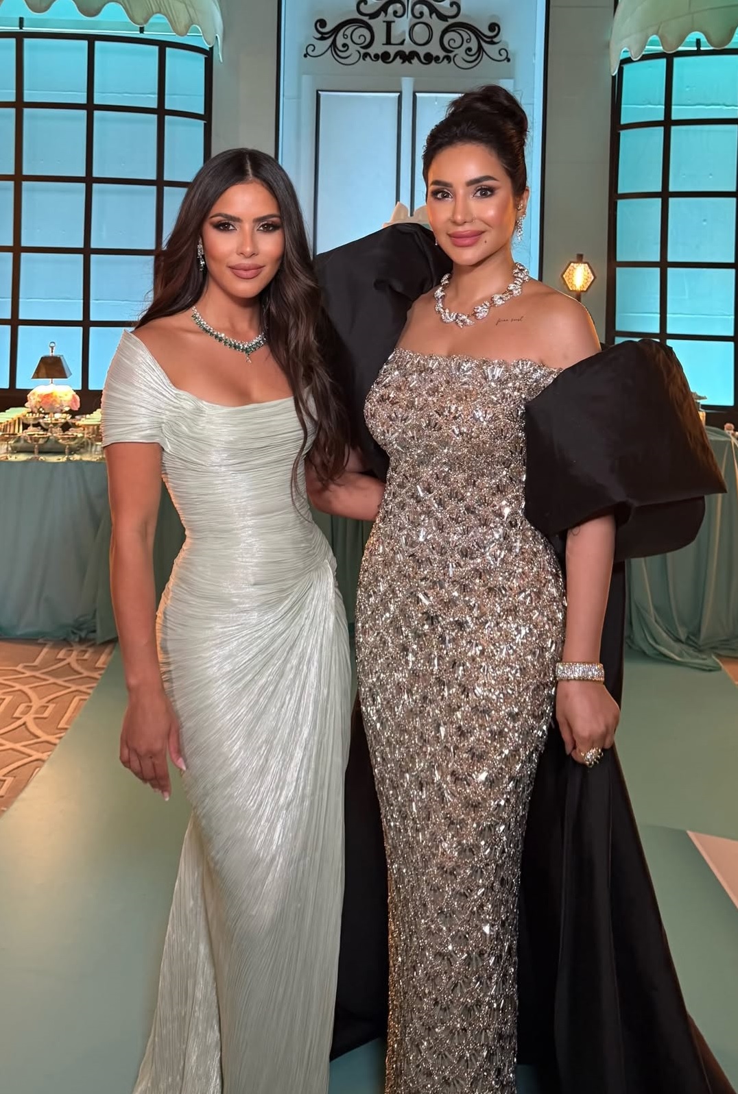 تألقت لجين بإطلالة سهرة أوف شولدر مرصعة بالأحجار الكريستالية بالكامل، مع كاب طويل ملتف حول الذراعين بأكمام منتفخة، وانسدل من الخلف بقصة ملكية على الأرض. أكملت إطلالتها بمجوهرات Tiffany and Co وتسريحة شعر على شكل كعكة منتفخة، ما منحها حضورًا ملكيًا وبارزًا بين الضيوف.
