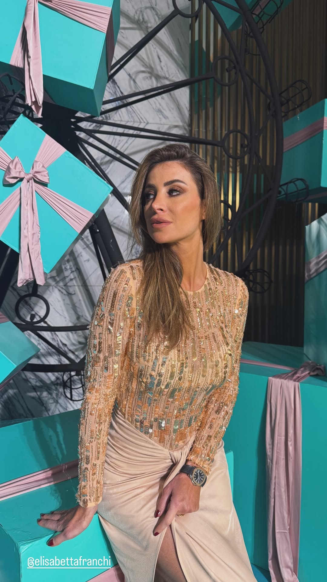 اختارت أنابيلا فستانًا من Elisabetta Franchi بتصميم خريفي أنيق، أكمام طويلة وياقة ضيقة، مزين بالترتر الذهبي والخرز، والجزء السفلي من المخمل البيج مع عقدة متدلية وفتحة أمامية. أكملت الإطلالة بصندل مرصع وترك شعرها منسدلاً بطريقة طبيعية.
