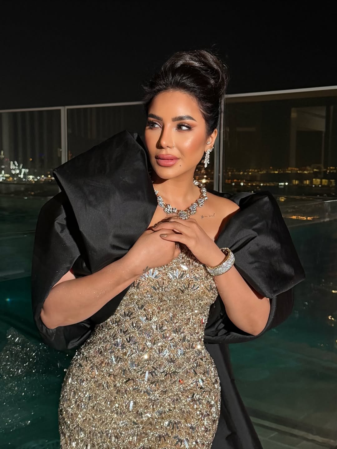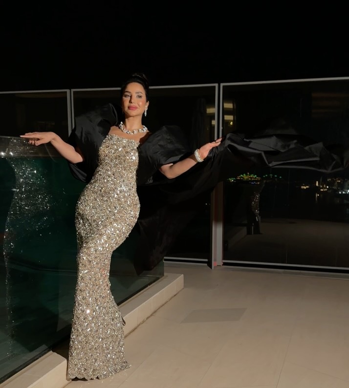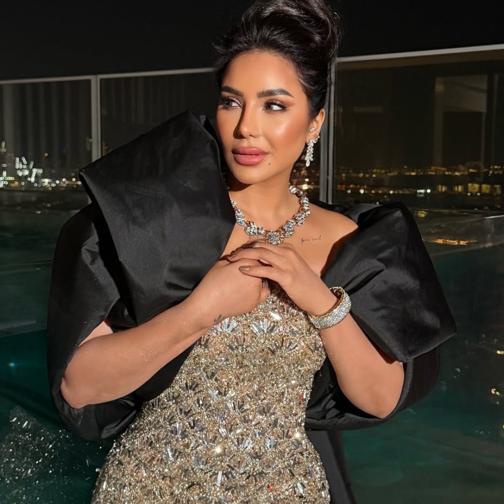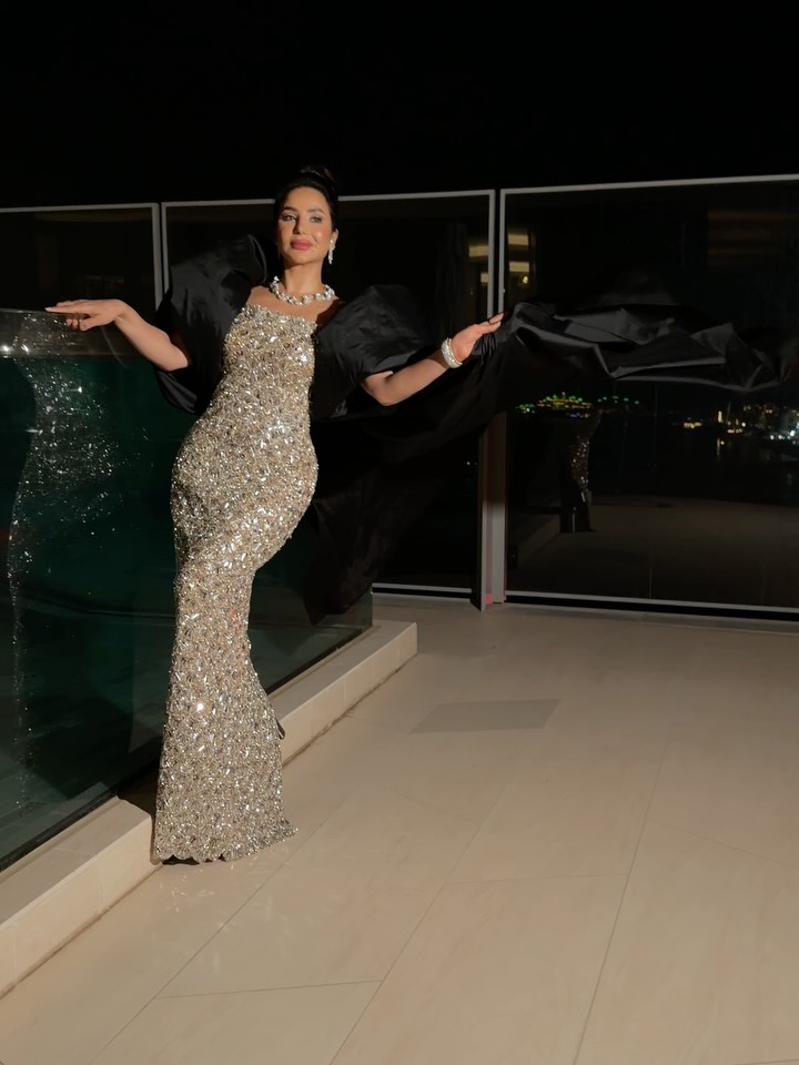 اختارت شذى فستانًا مجسمًا بالياقة المربعة والحمالات الرفيعة، بطول الكاحل، مزين بالزمزمة، مع قفاز عالي من الحرير وصندل أسود، وحقيبة كريستالية ومجوهرات مرصعة، مع تسريحة شعر كلاسيكية لامعة.