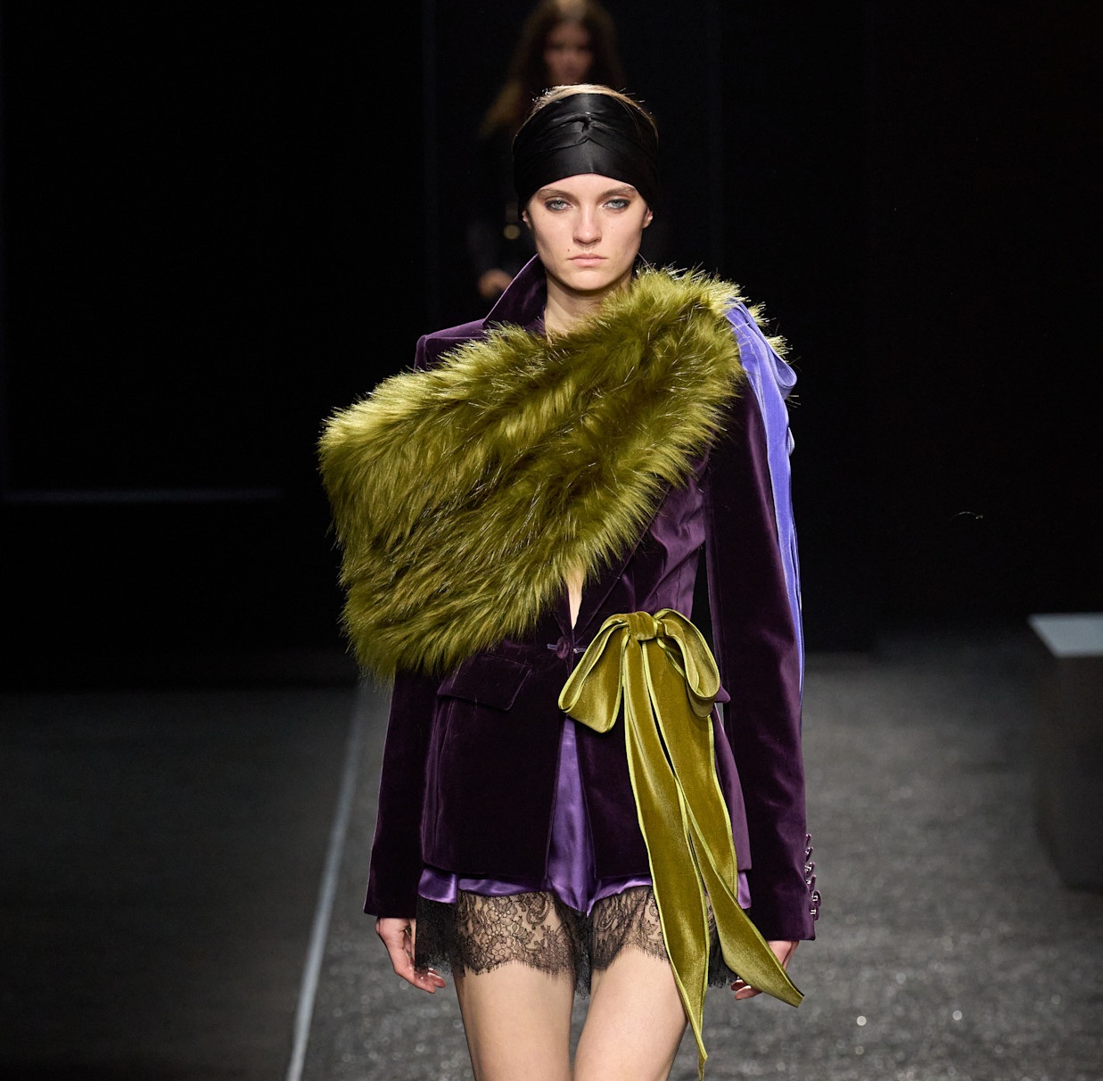 فضلت أسيل عمران إطلالة رقيقة بطابع ناعم، بفستان سترابلس من المخمل البنفسجي الداكن، خالٍ من النقوشات، بانسيابية ثنيات وانتهى بذيل طويل، مع عقدة جانبية متدلية على الخصر. نسقت الإطلالة مع مجوهرات Tiffany and Co، وترك شعرها منسدلاً على شكل ويفي ناعم.
