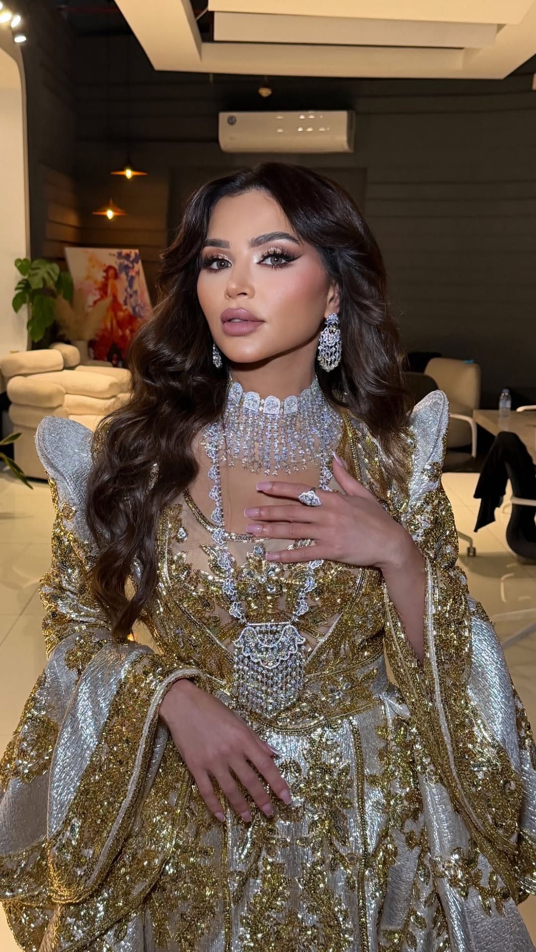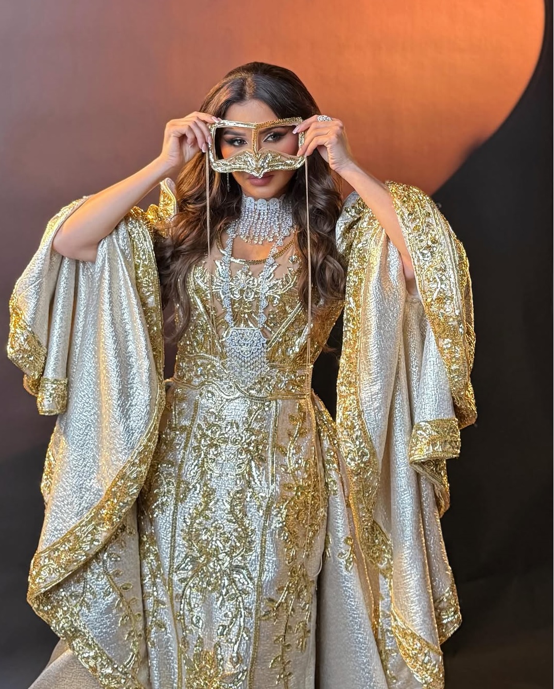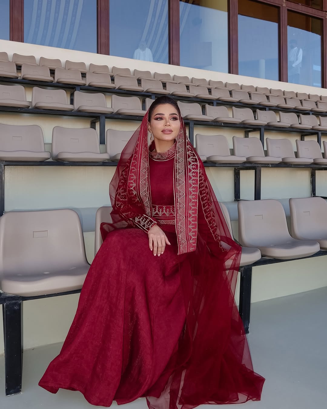 كما ارتدت فستانًا طويلًا باللون البرغندي مزينًا بتطريزات ذهبية، مع وشاح شفاف يزين الرأس، وقصة خصر محددة وحزام عريض، وتسريحة كعكة أمامية منتفخة وأقراط ذهبية.