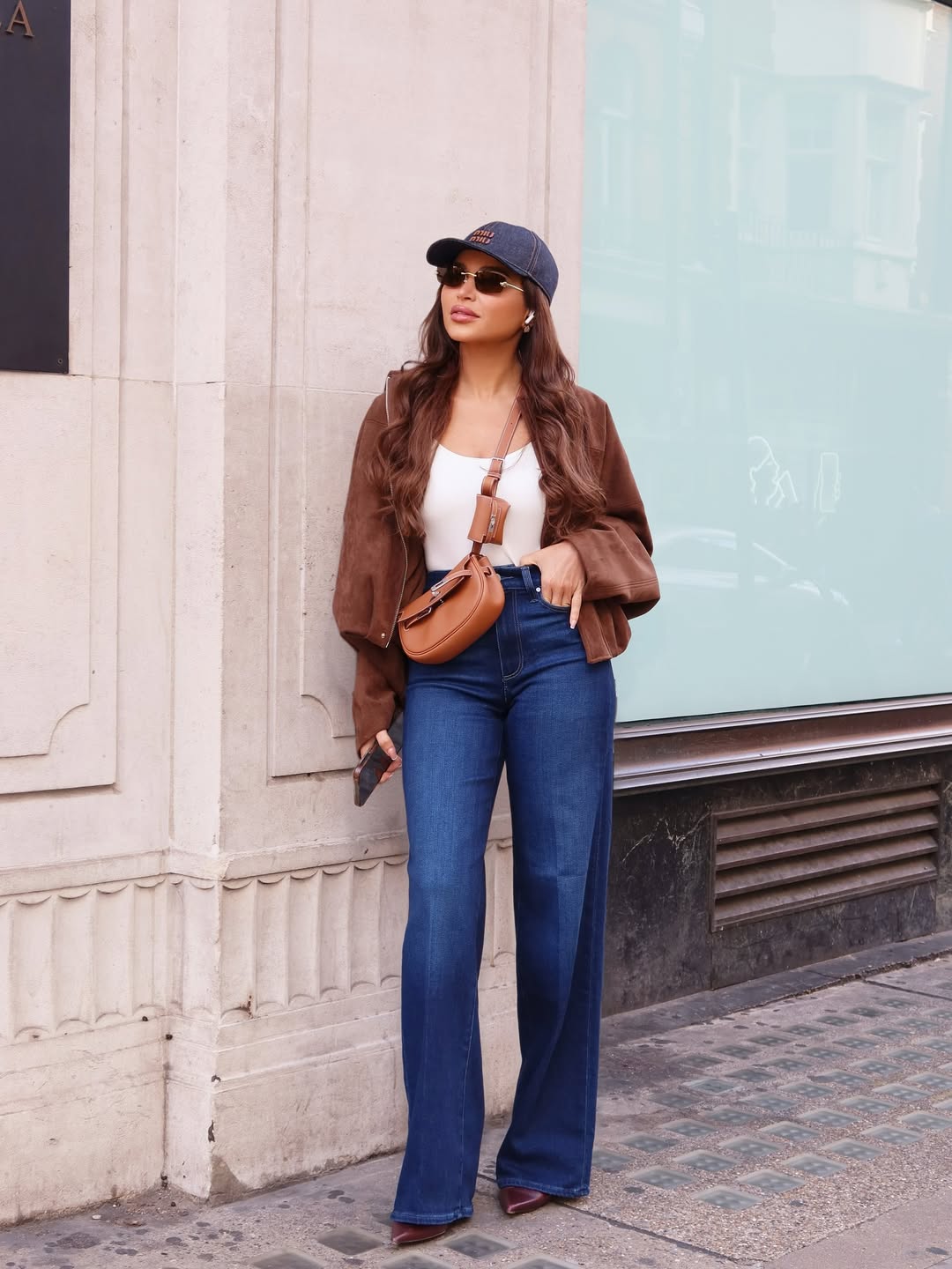بنطال جينز واسع مع توب أبيض وجاكيت قصير من المخمل، وحقيبة كروس وقبعة بيسبول متناغمة، لإطلالة يومية مريحة وعصرية.