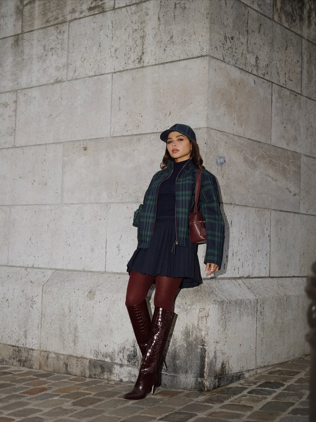 تنورة قصيرة بصيحة البليسيه باللون الأزرق الداكن، مع توب وجاكيت منسقين، وقبعة بيسبول، وجوارب وحقيبة بوت غامقة للتمازج الجريء.